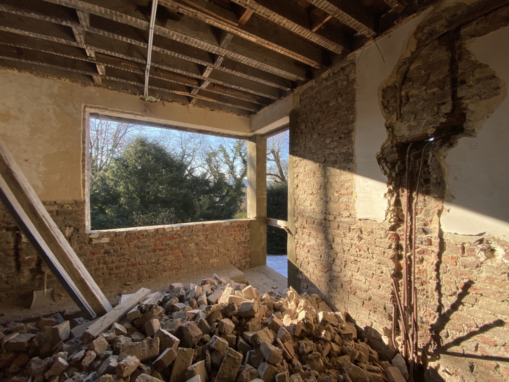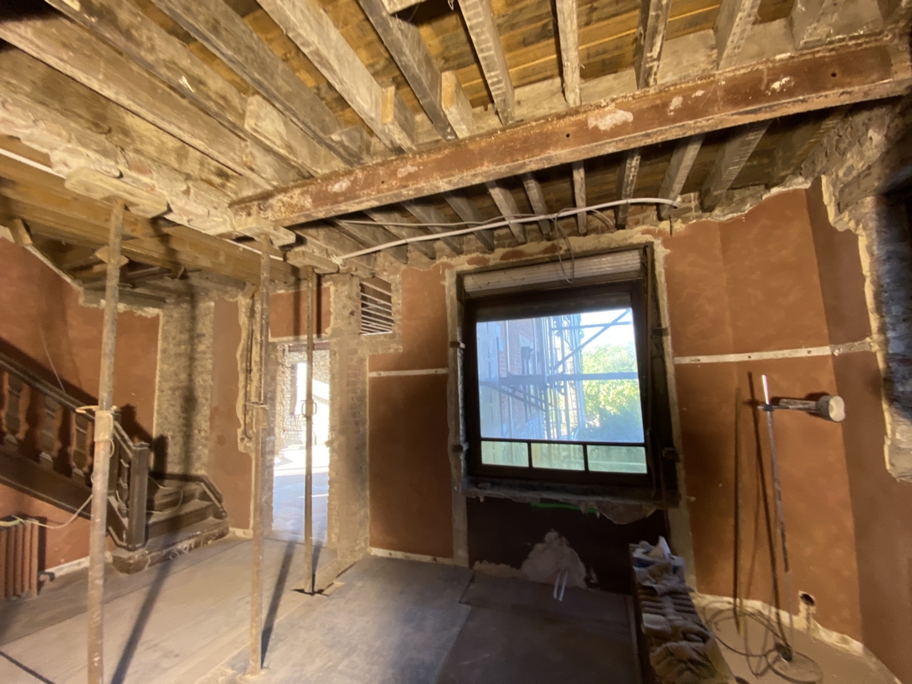 La rénovation intérieure concerne essentiellement le rez-de-chaussée. Les transformations en cours permettront de répondre aux habitudes de vie actuelles. L’ouverture de larges baies intérieures et extérieures agrandira les espaces et créera une connexion visuelle entre-eux et avec l’extérieur. Toutes les installations techniques et les parachèvements seront rénovés. Les menuiseries intérieures d’époque seront maintenues et rénovées, telles que parquets, portes et escalier en chêne massif. Un nouveau garde-corps longeant la grande cage d’escalier centrale amènera une note contemporaine à cet intérieur totalement rénové.