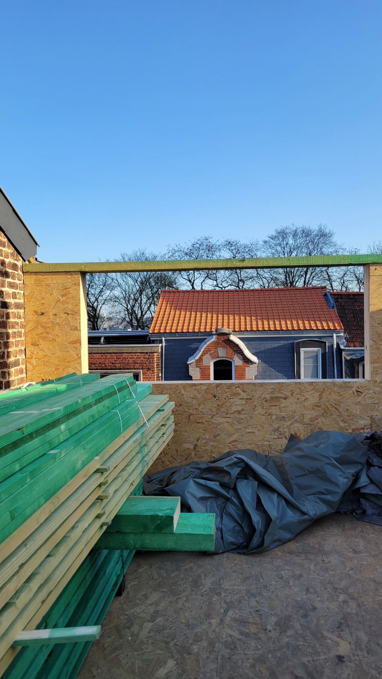 En ville, un chantier dépasse toujours les limites de la parcelle. Sur ce projet de réhausse en ossature bois à Liège, plusieurs décisions engagent aussi les voisins à cause des mitoyennetés et des constructions existantes en toiture.