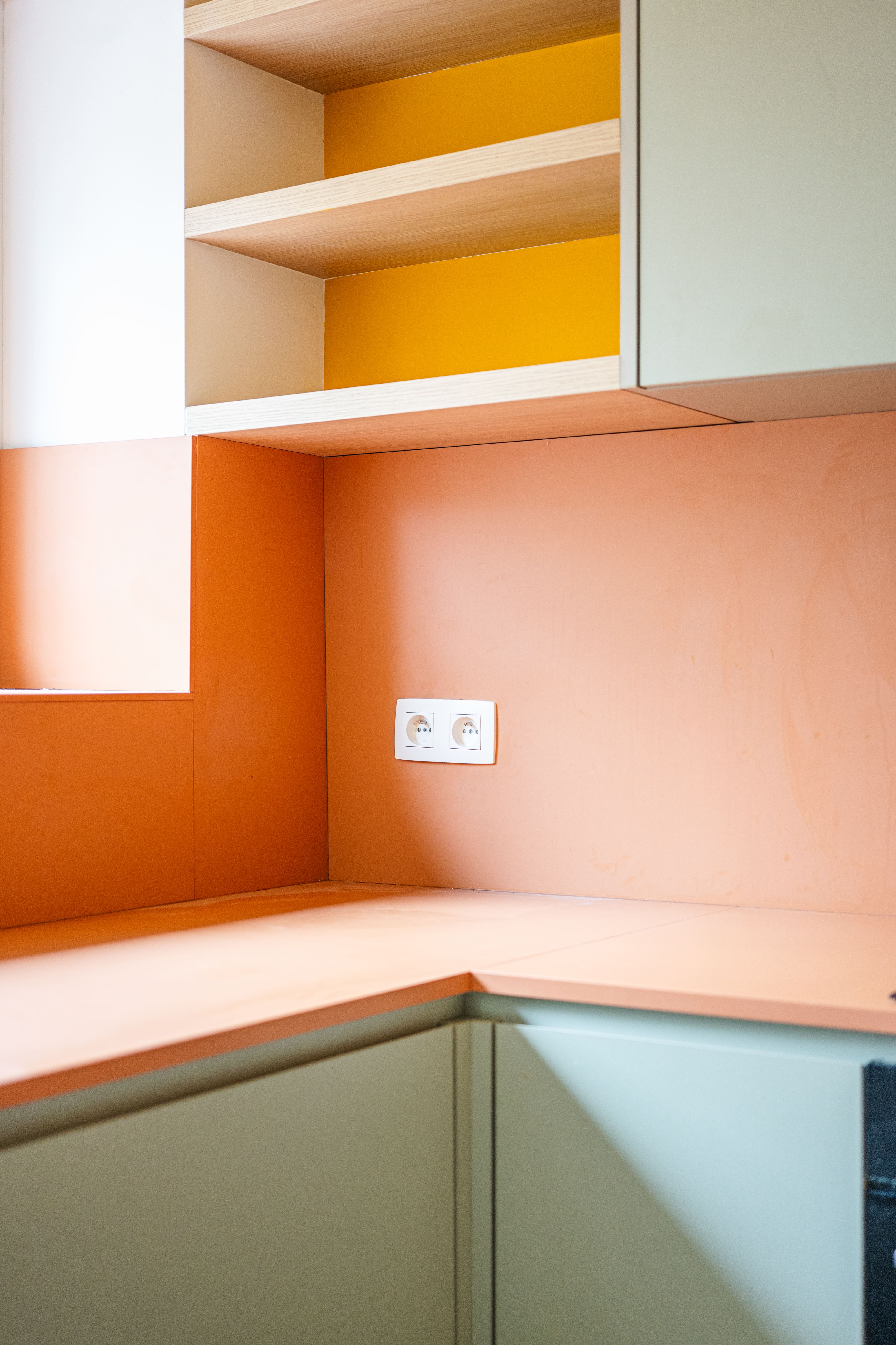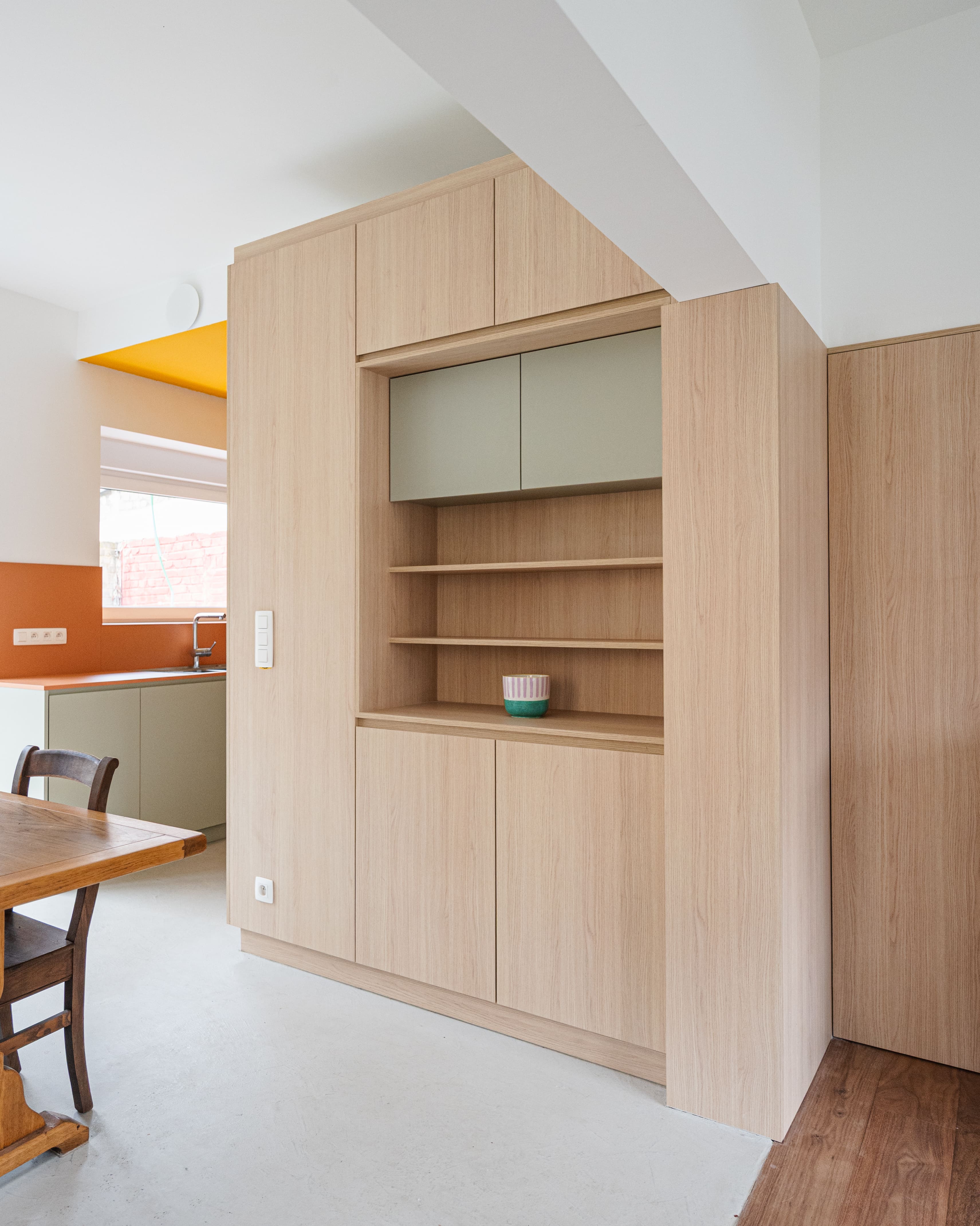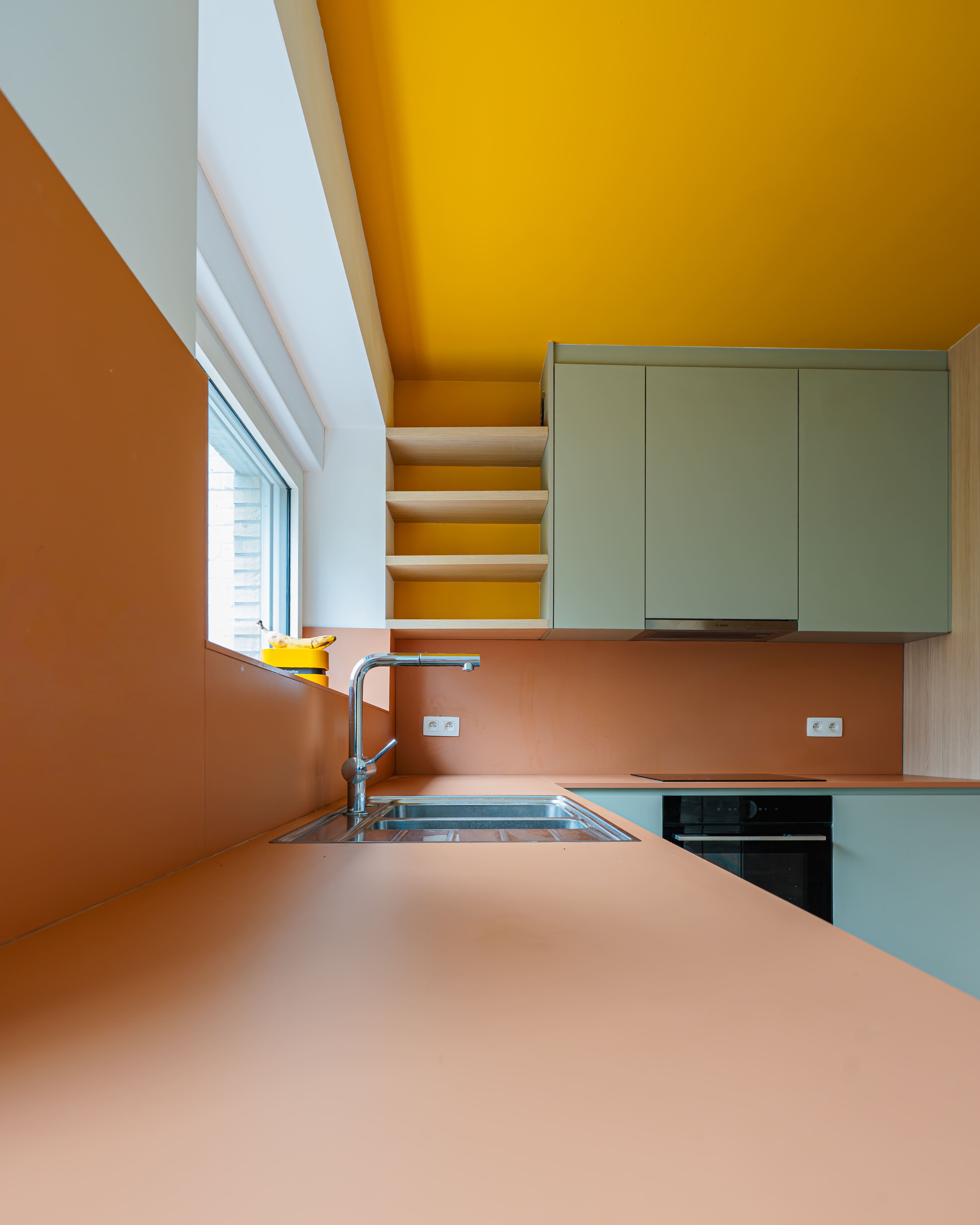 Après les difficultés administratives, nous vivrons l’inertie et les retards d’entreprises, ainsi que de nombreux imprévus avec ce bâtiment dont la construction d’origine était peu qualitative. Toutefois, ce projet illustre parfaitement notre savoir-faire : rénover durablement un logement urbain et l’aménager totalement. En effet, nous avons dessiné l’intégralité de la cuisine et du mobilier, qu’une menuiserie belge réalisera sur mesure. Une décoratrice liégeoise applique les enduits à la chaux. Du concept initial au choix des teintes de peinture, nous aurons maîtrisé et suivi chaque détail.