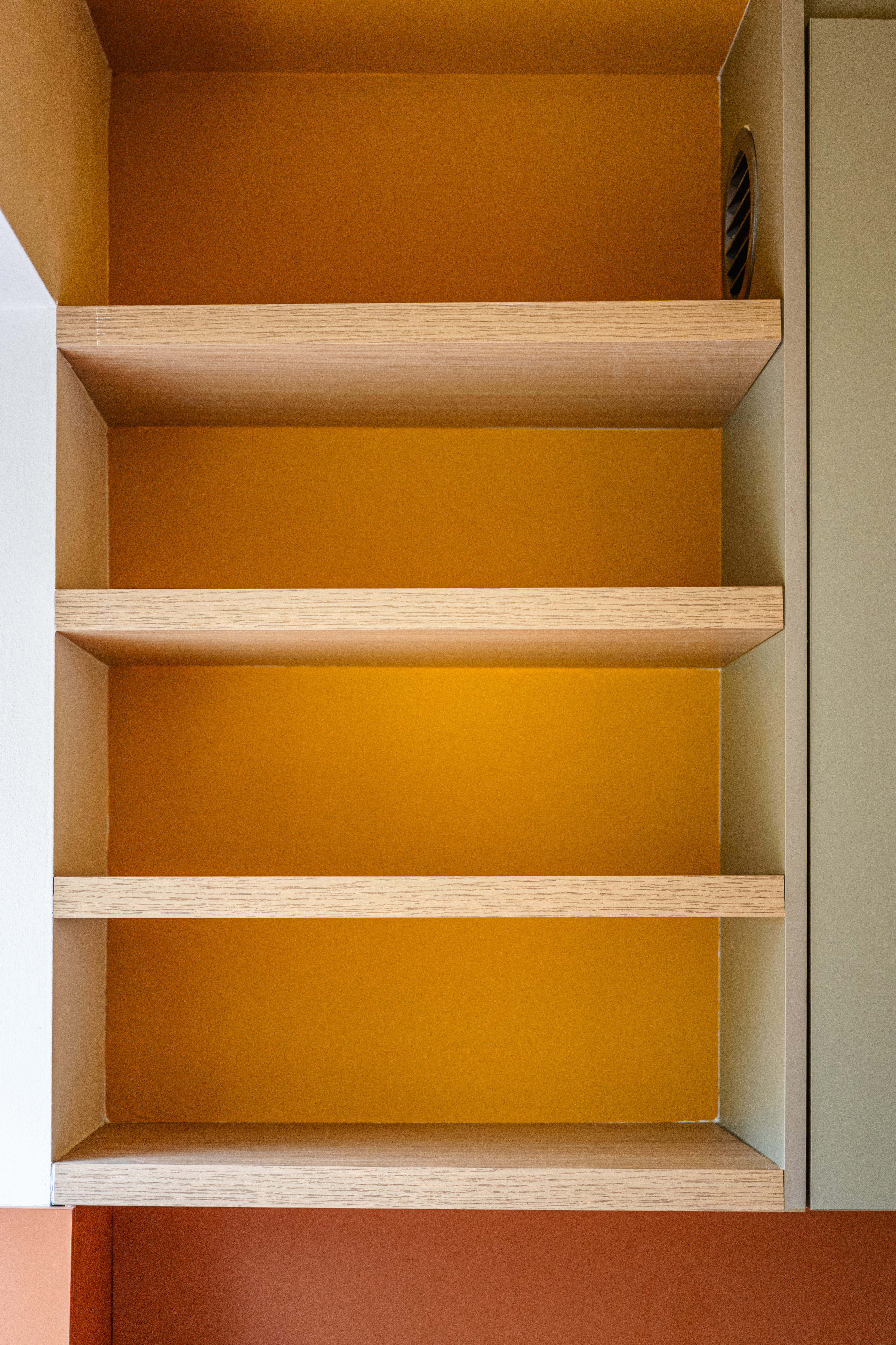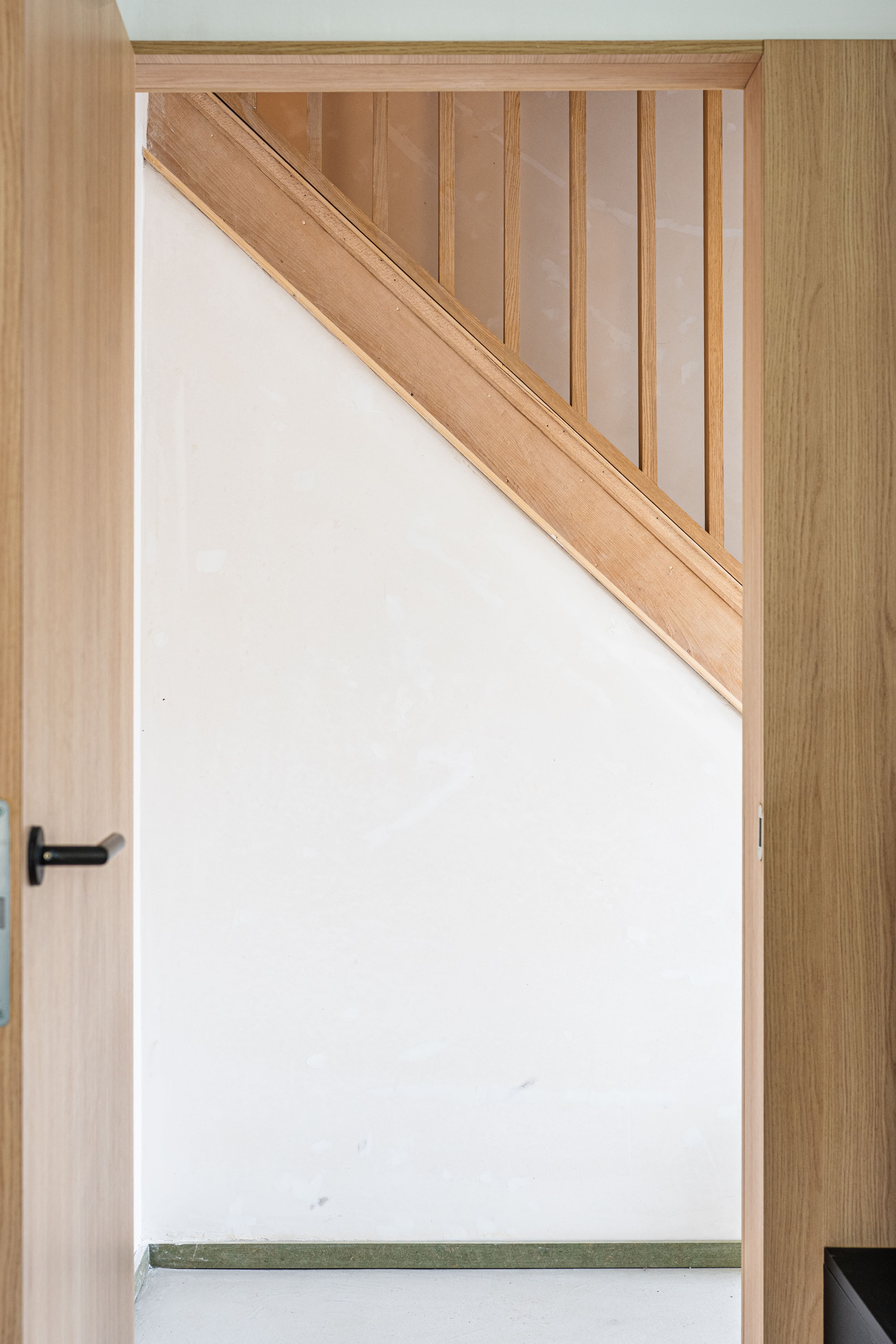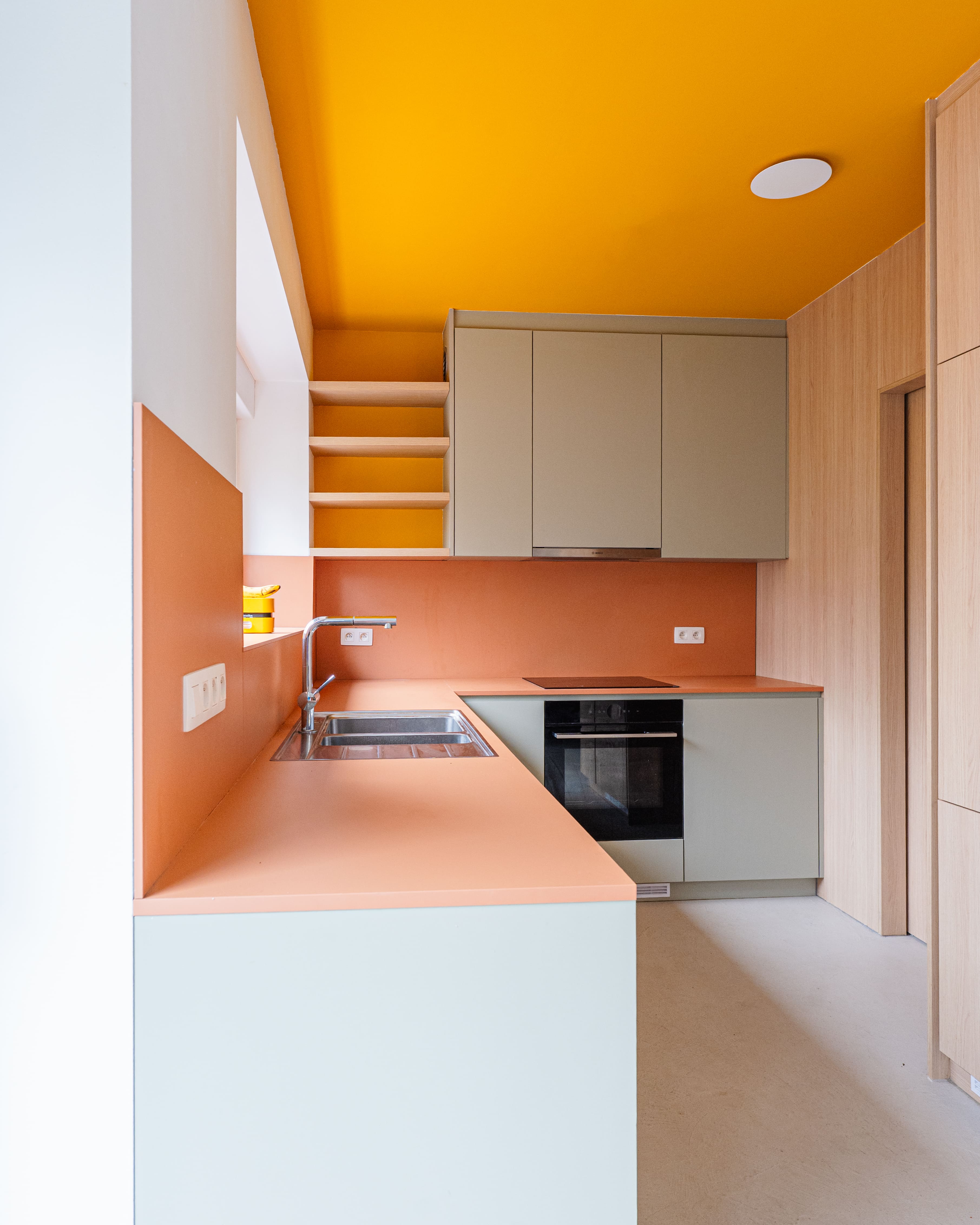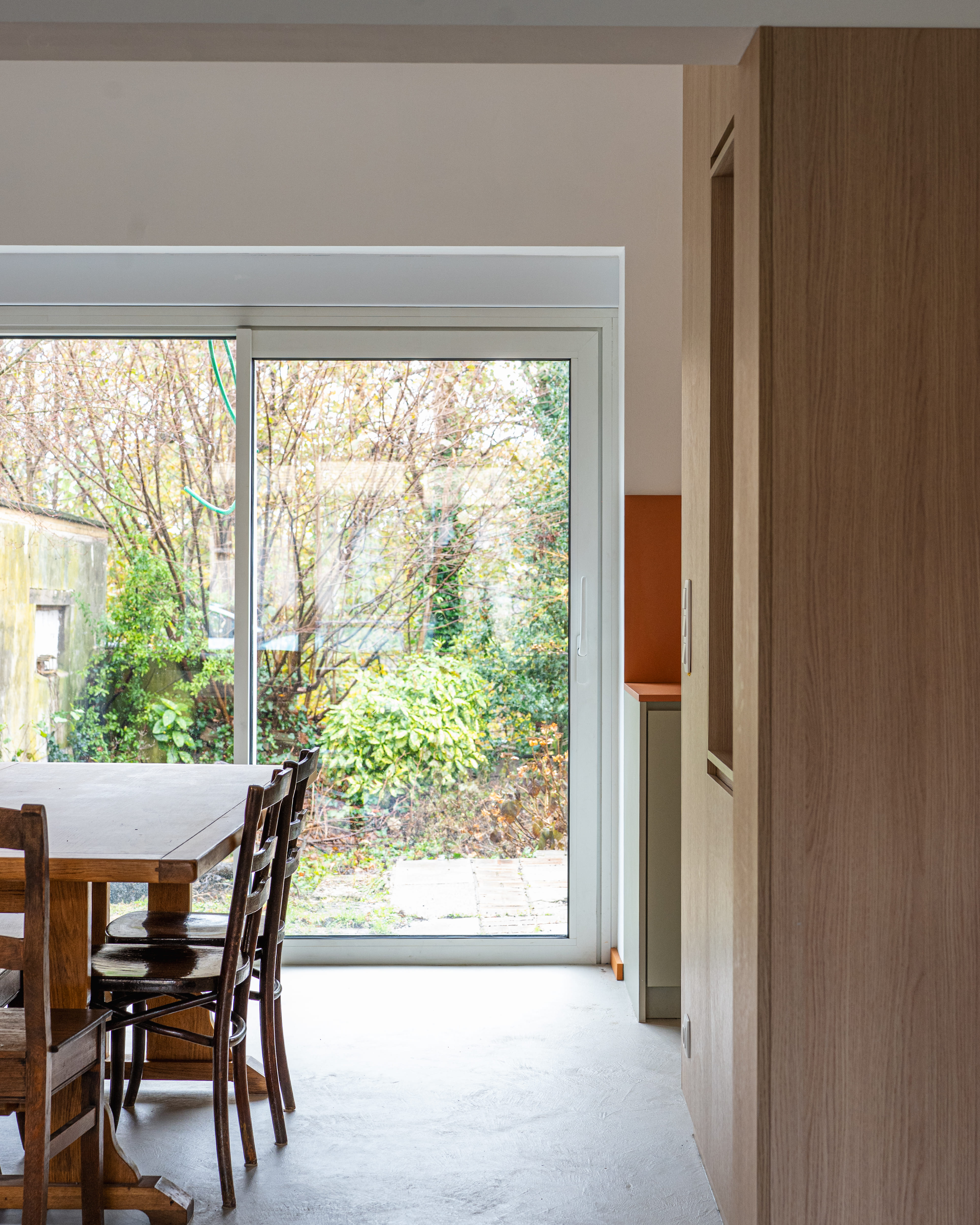 Après les difficultés administratives, nous vivrons l’inertie et les retards d’entreprises, ainsi que de nombreux imprévus avec ce bâtiment dont la construction d’origine était peu qualitative. Toutefois, ce projet illustre parfaitement notre savoir-faire : rénover durablement un logement urbain et l’aménager totalement. En effet, nous avons dessiné l’intégralité de la cuisine et du mobilier, qu’une menuiserie belge réalisera sur mesure. Une décoratrice liégeoise applique les enduits à la chaux. Du concept initial au choix des teintes de peinture, nous aurons maîtrisé et suivi chaque détail.