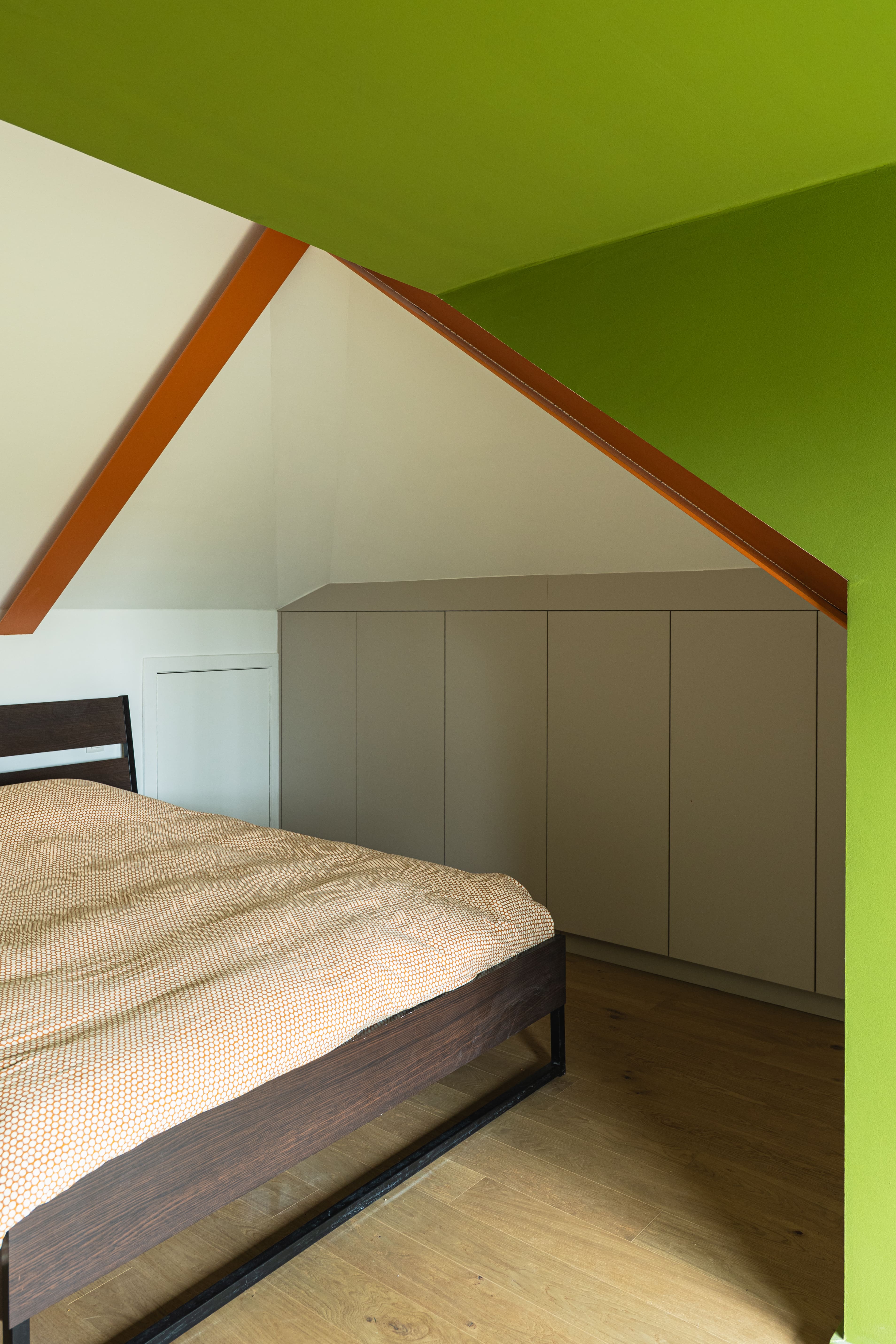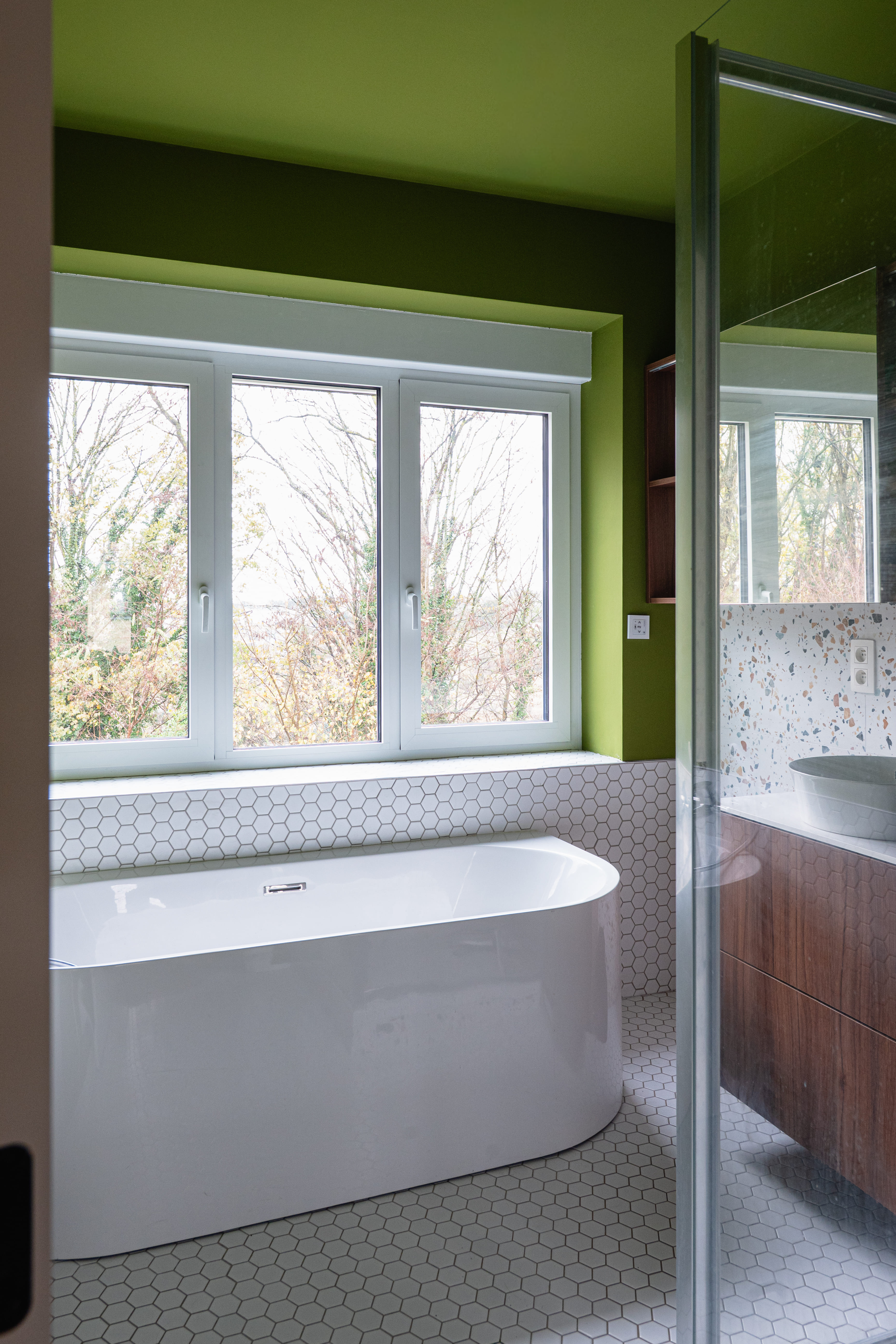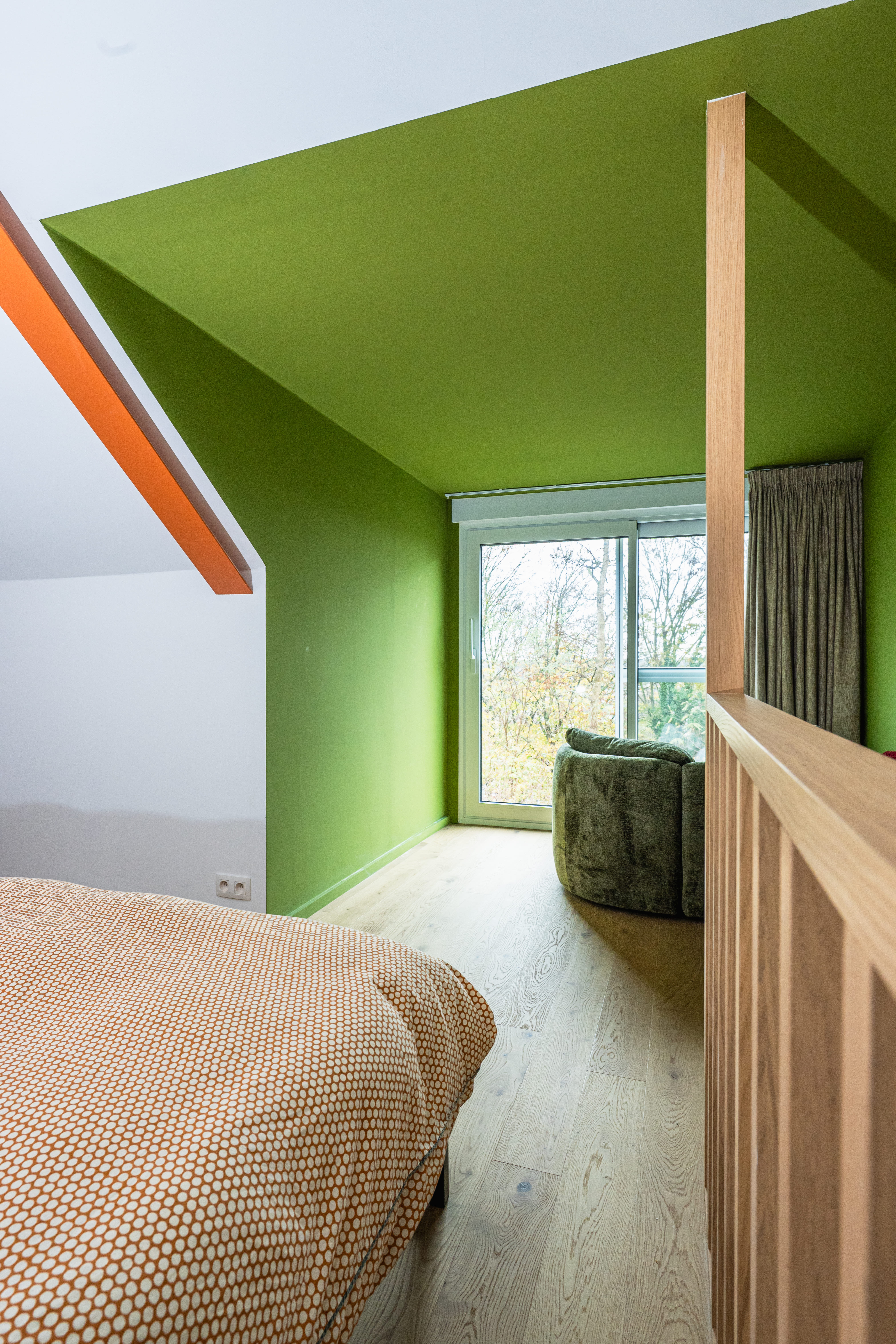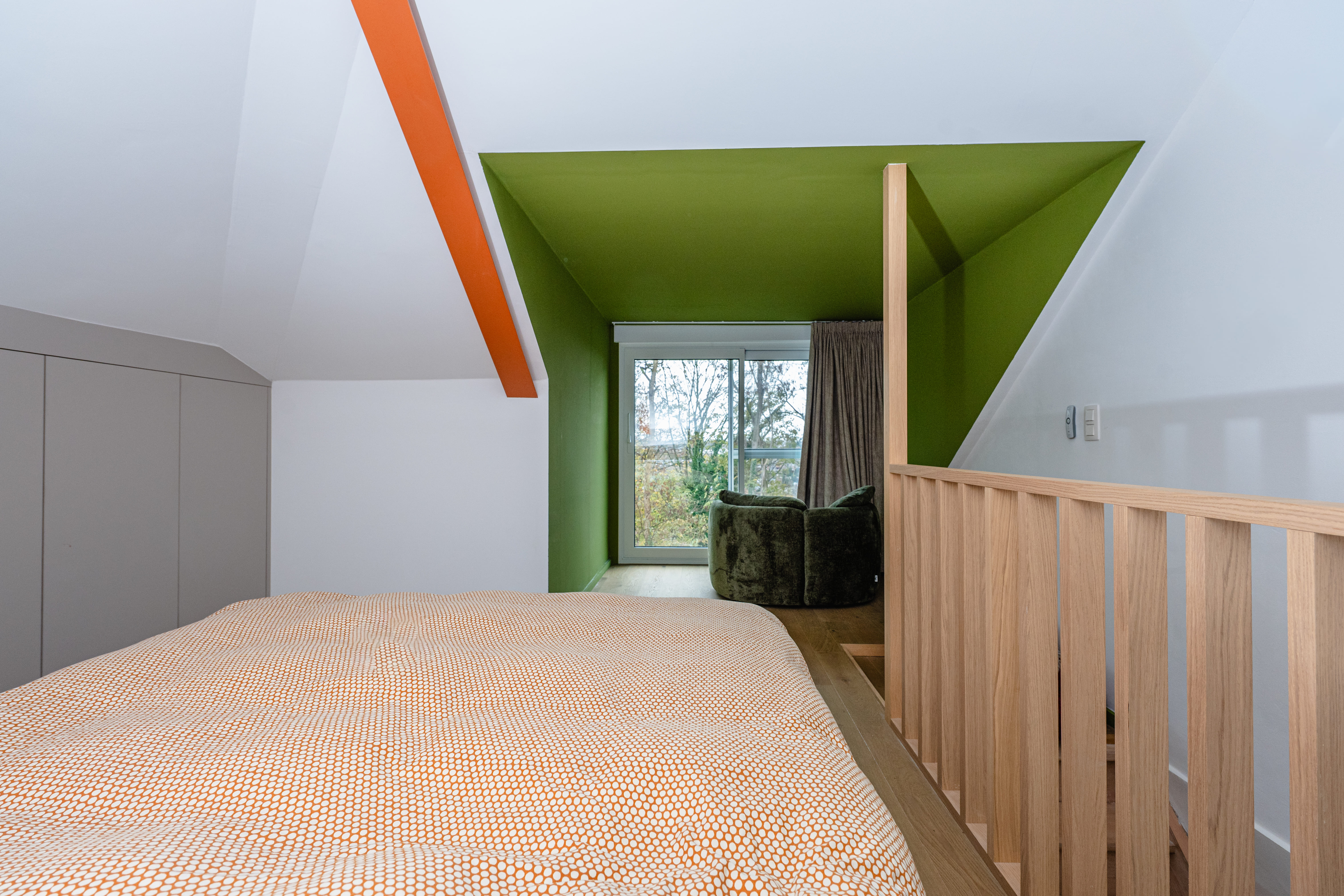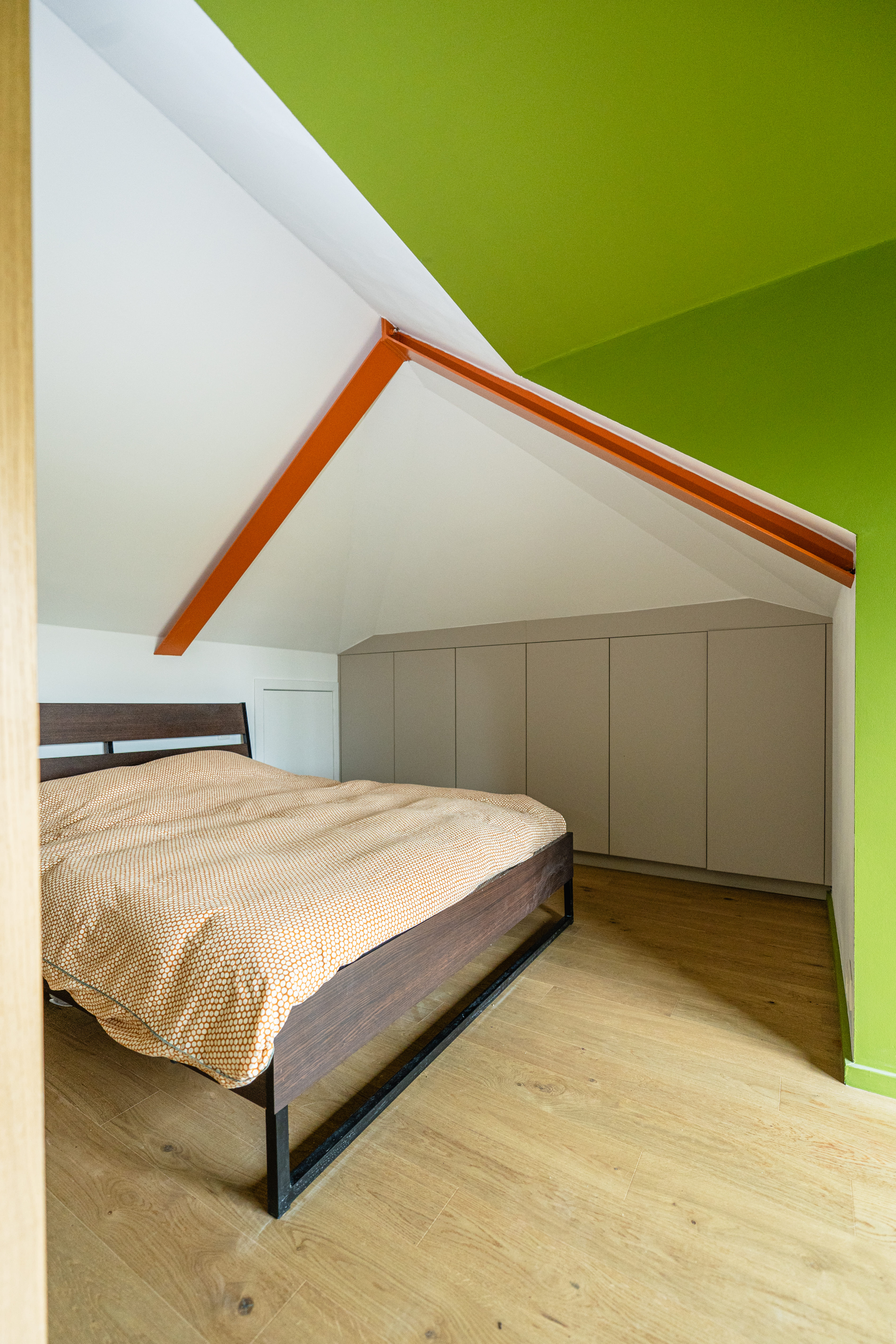 Nous rehaussons légèrement l’espace sous toiture pour le rendre habitable. Une ferme de charpente métallique réduit l’encombrement de la toiture pour abriter une chambre avec dressing et un grenier technique pour la VMC. Une lucarne large et haute dégage de la hauteur à la sortie de l’escalier et offre une vue dégagée sur le bois en fond de parcelle. Nous agrandissons les baies existantes pour améliorer le confort lumineux et capter les apports solaires hivernaux. Des screens solaires équipent la plupart des fenêtres pour éviter la surchauffe estivale.