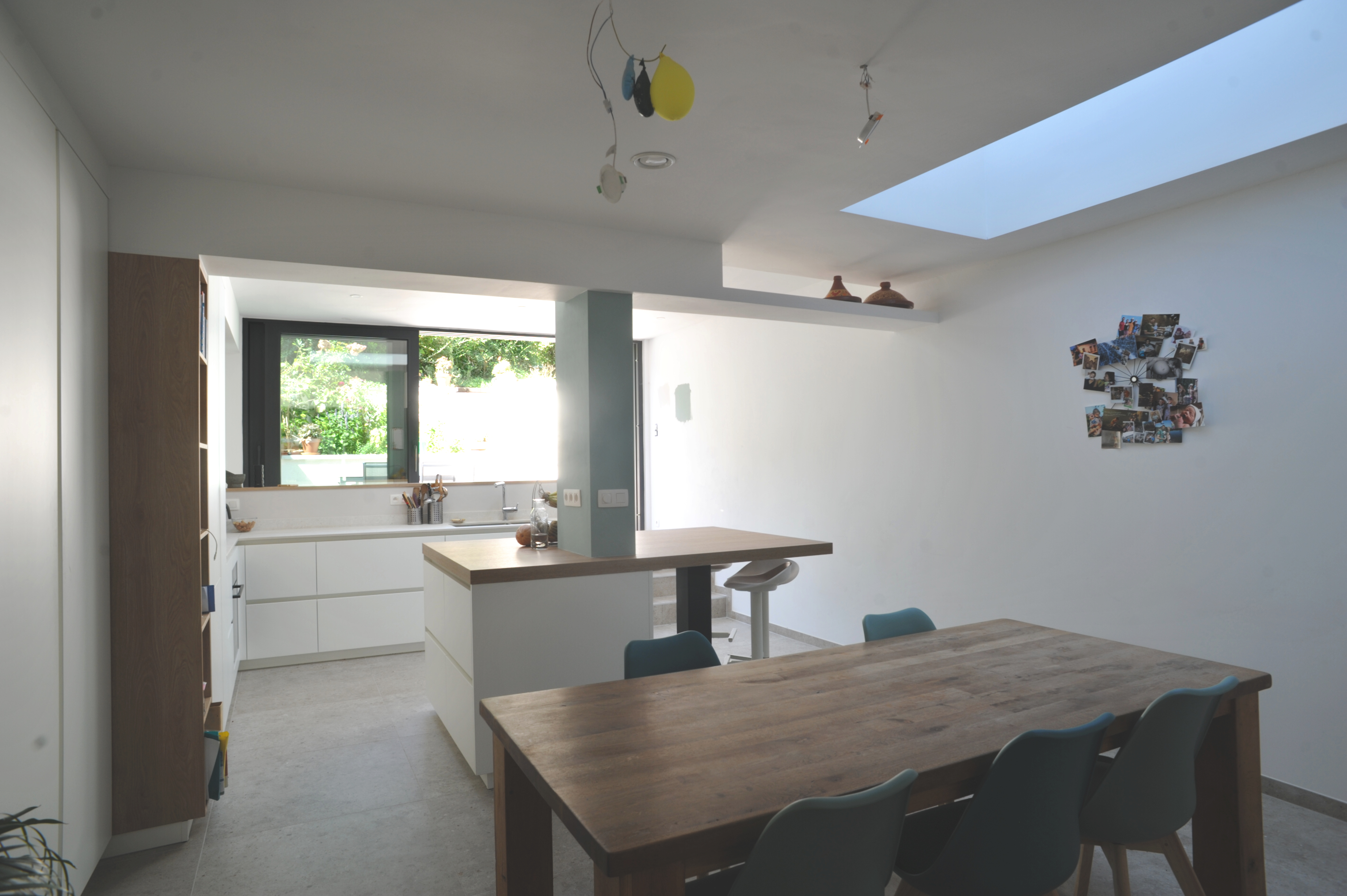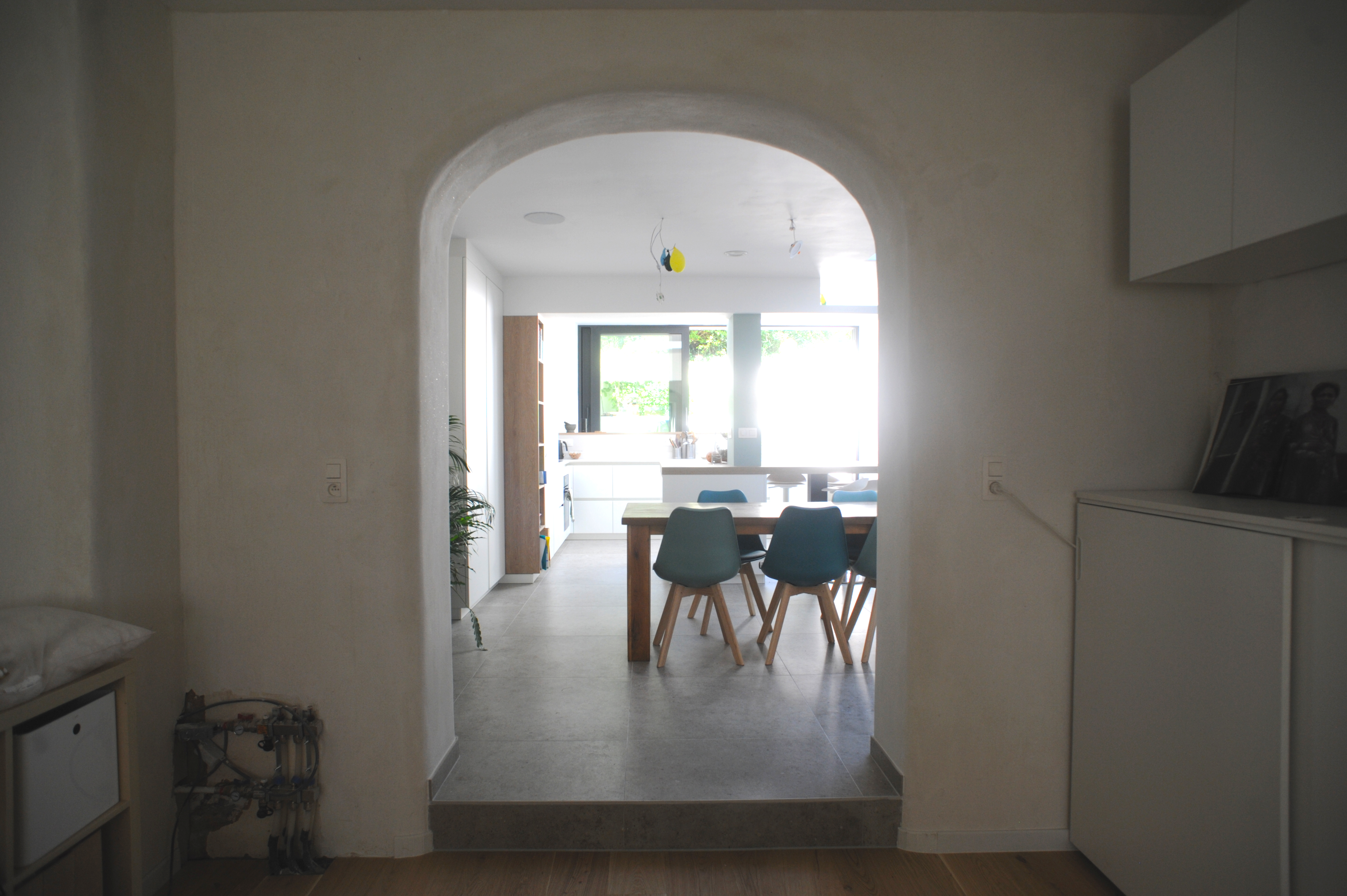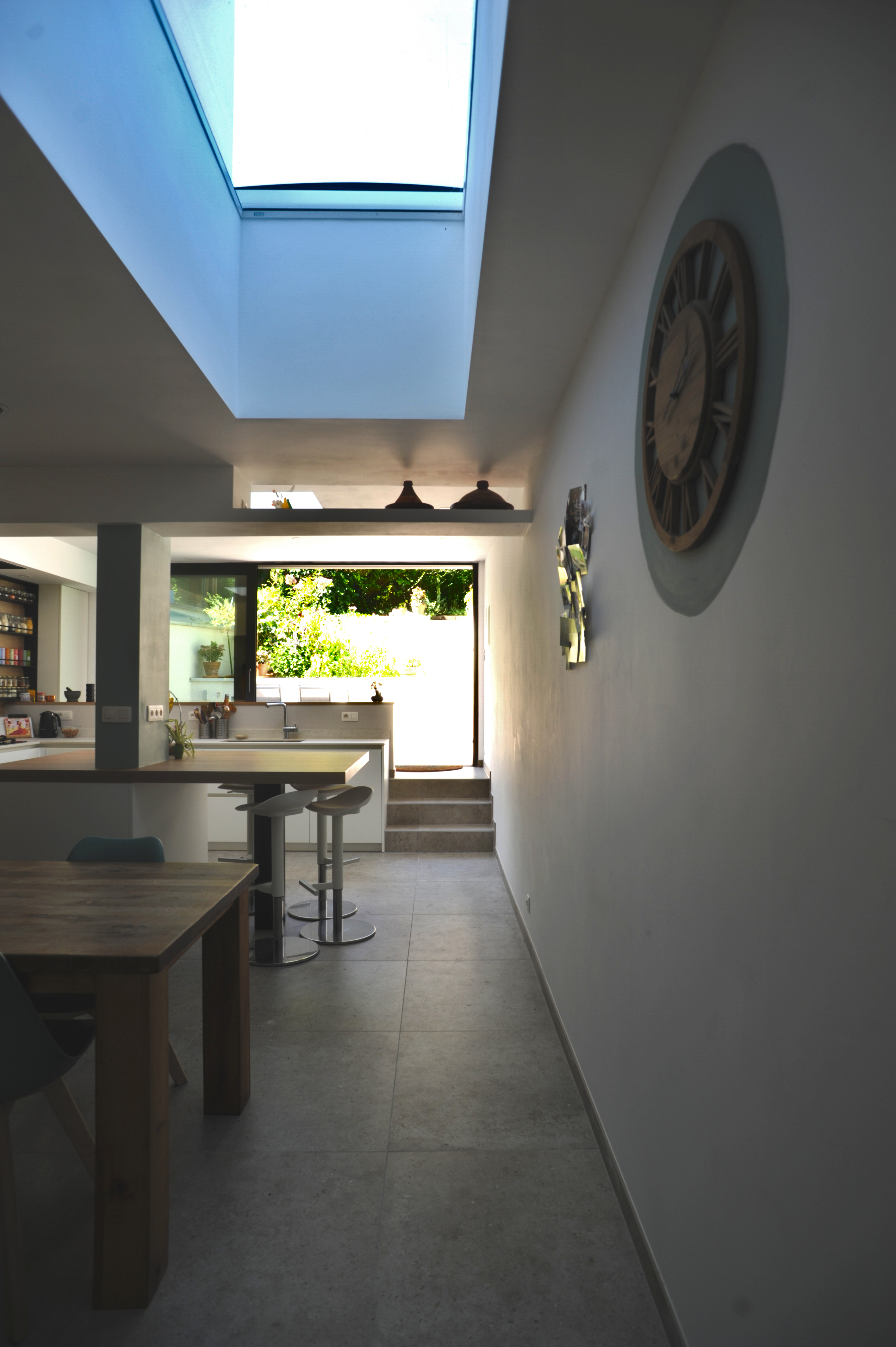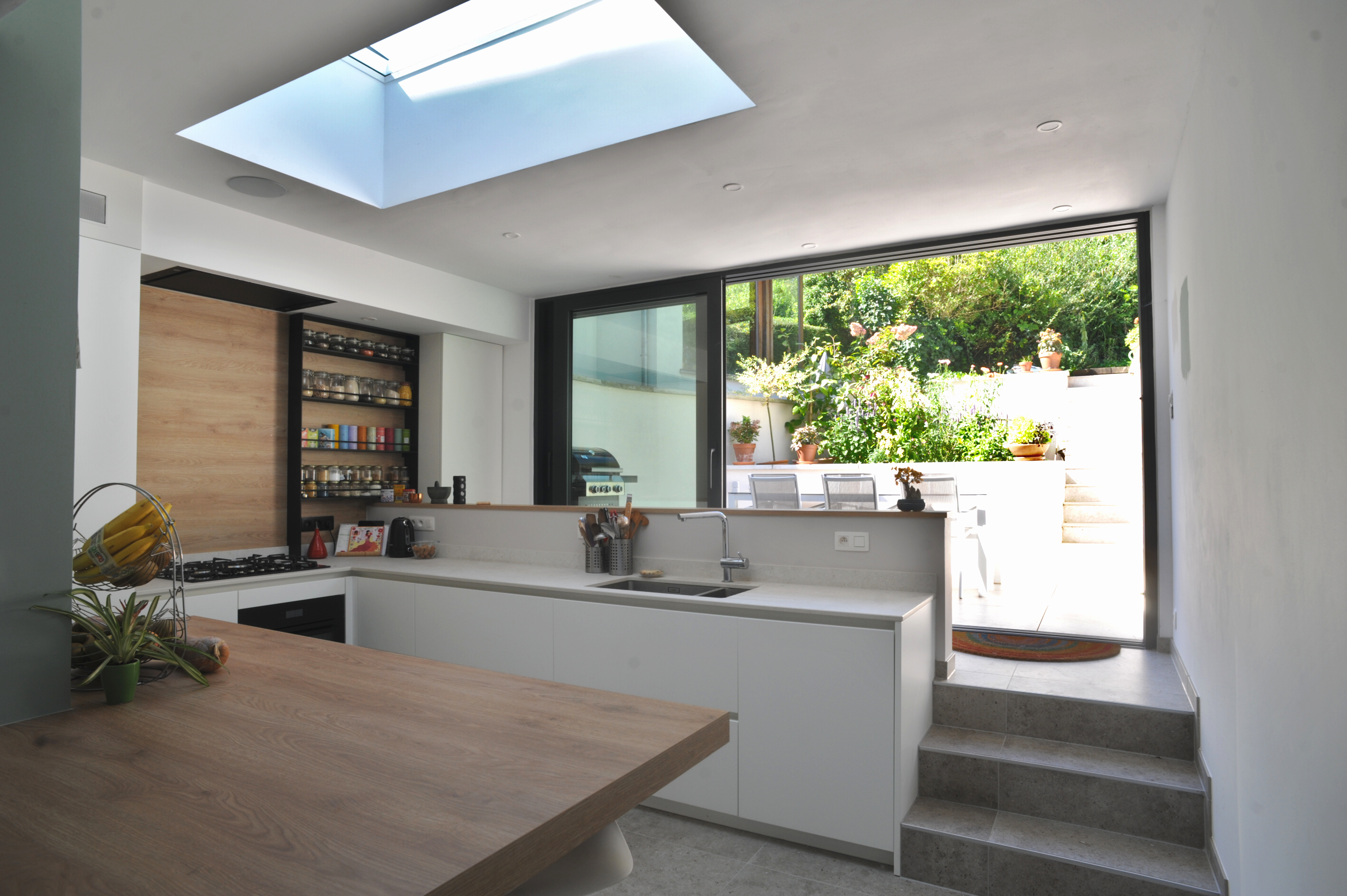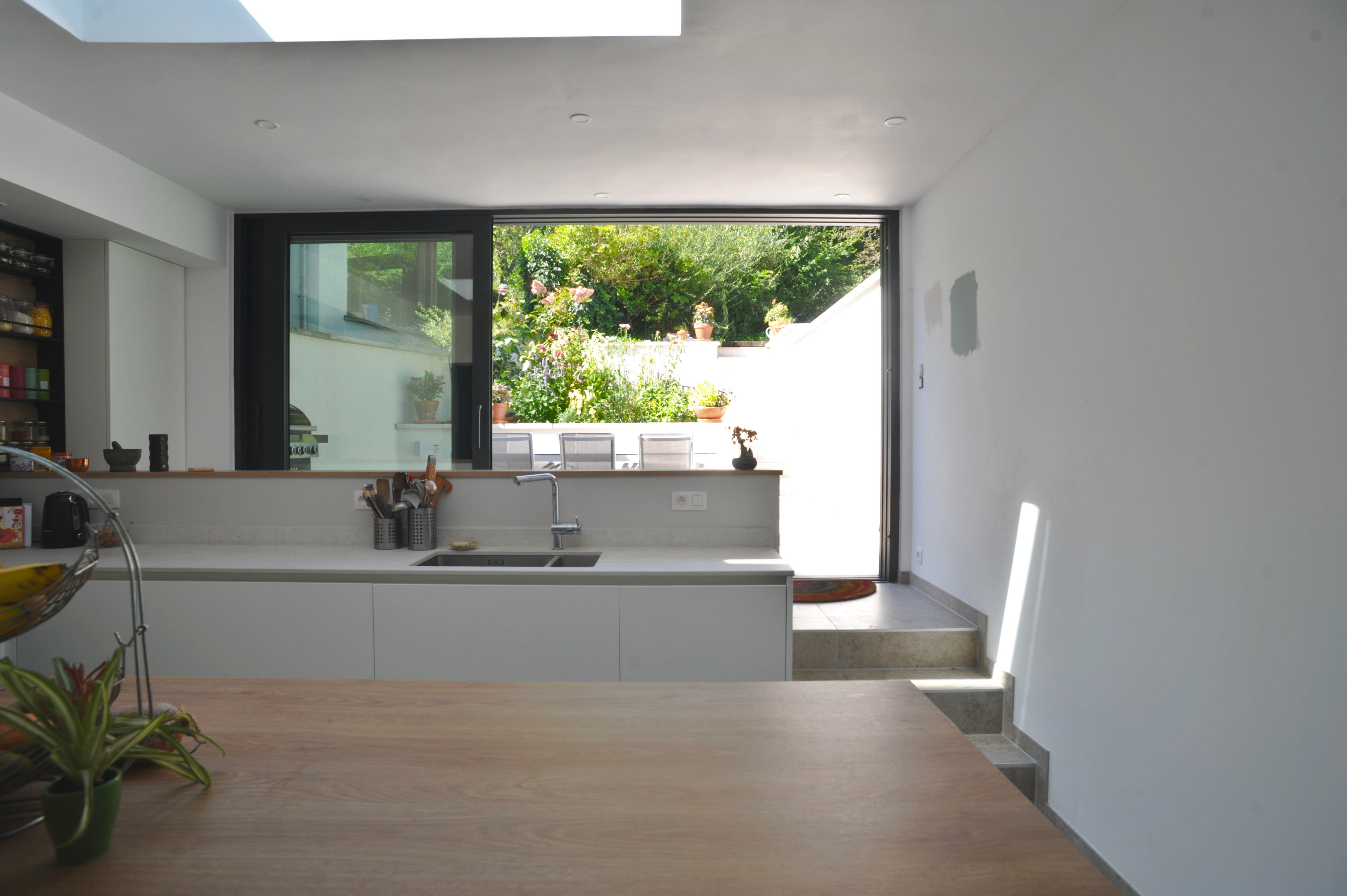 La proposition architecturale prévoit de démolir l’annexe existante ainsi que la véranda. Une nouvelle extension, occupant toute la largeur de la parcelle, les remplacera. Ce choix permettra d’amener de la lumière naturelle et d’ouvrir les vues vers le jardin. De plus, un travail de paliers accompagnera cette nouvelle organisation : la cuisine se situera légèrement en hauteur, tandis que quelques marches mèneront à la terrasse. Cette différence de niveaux renforcera la continuité visuelle et physique entre les espaces.