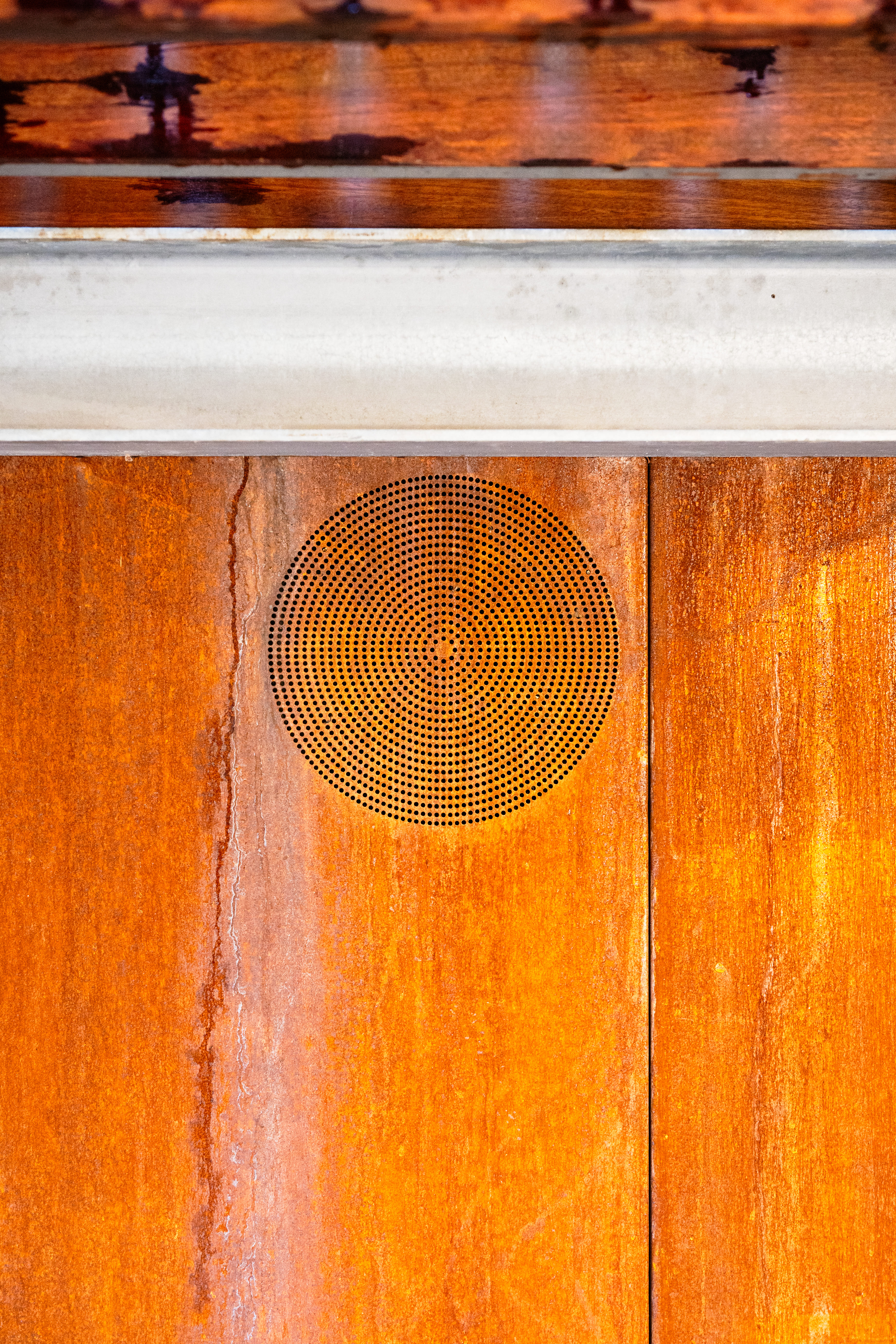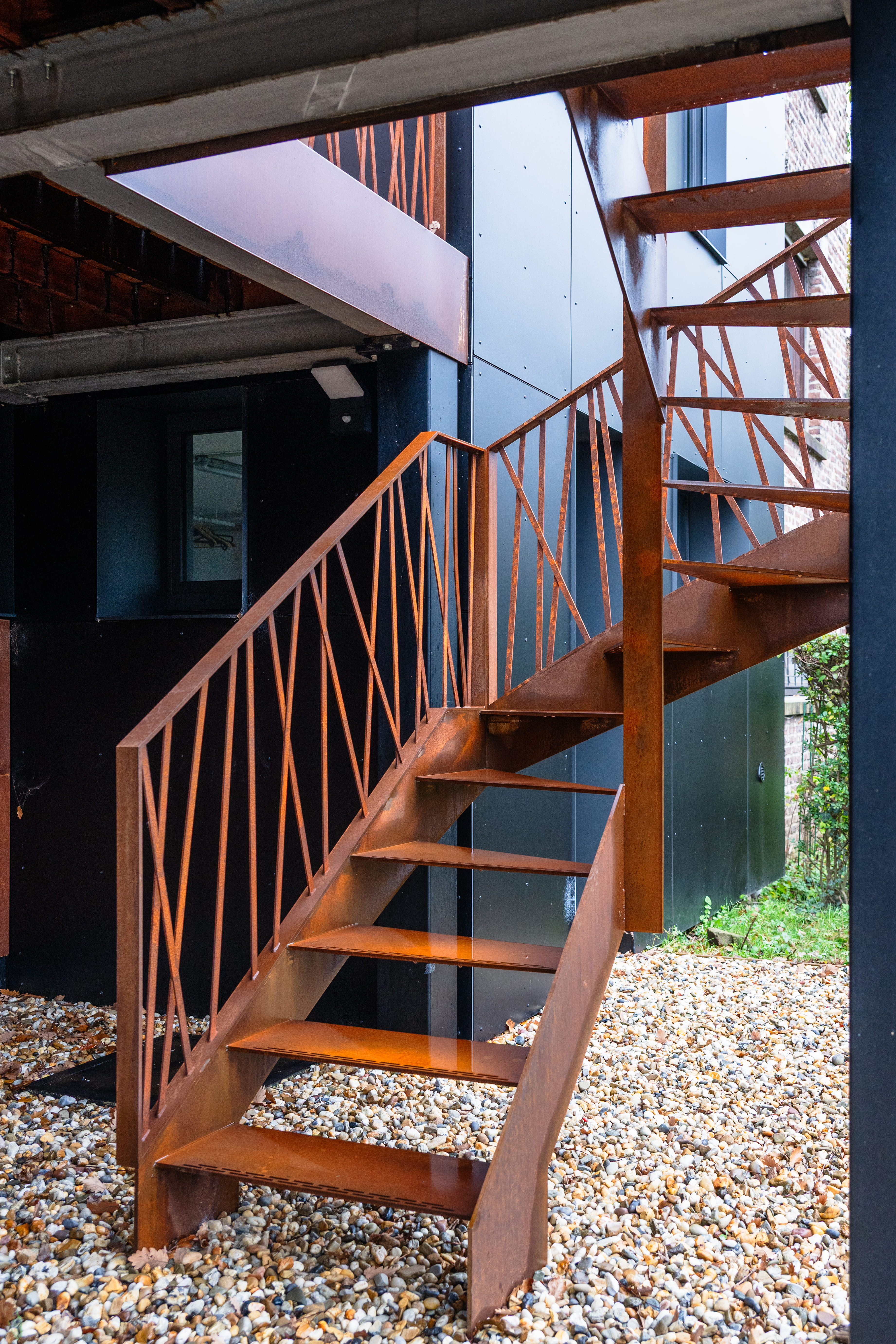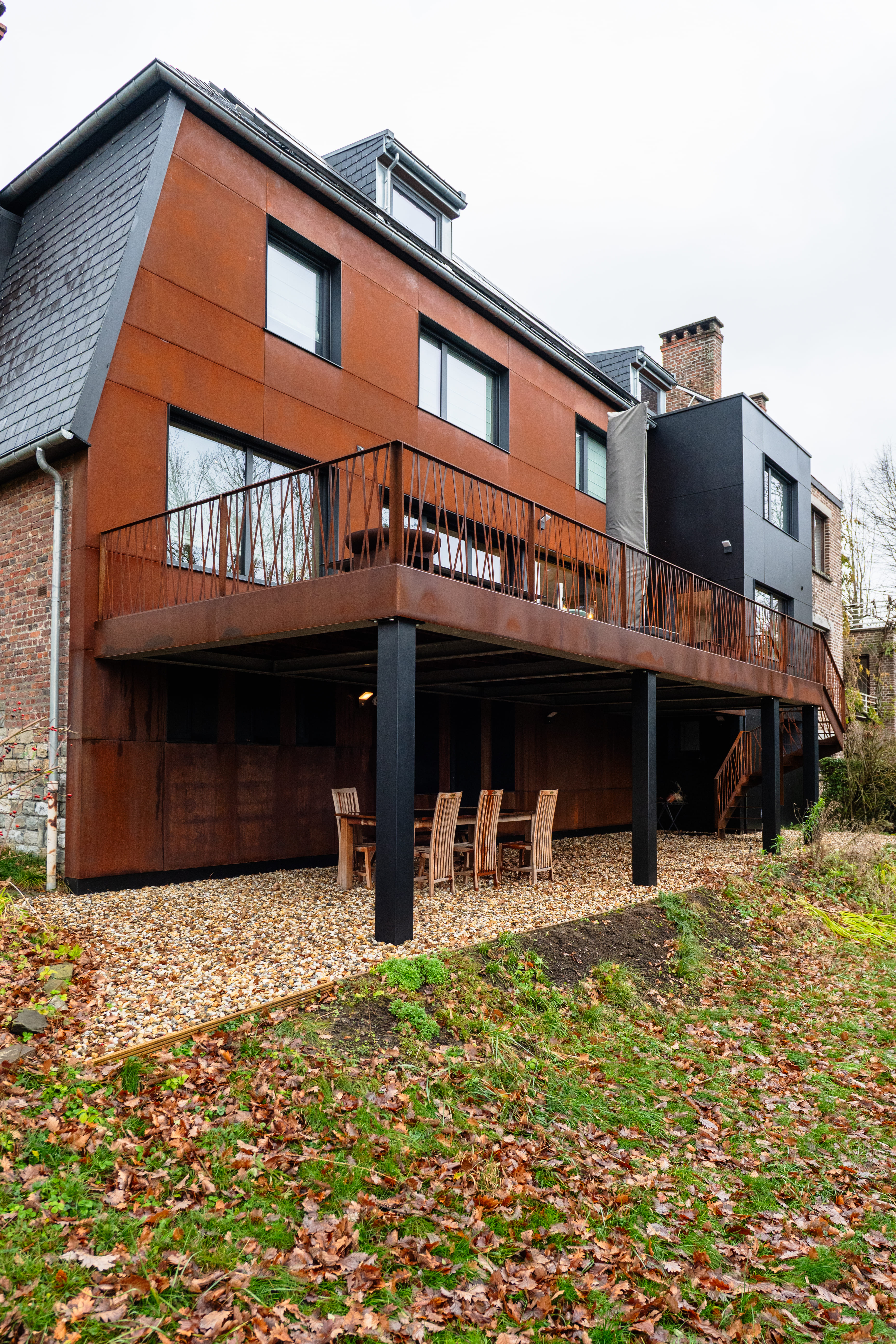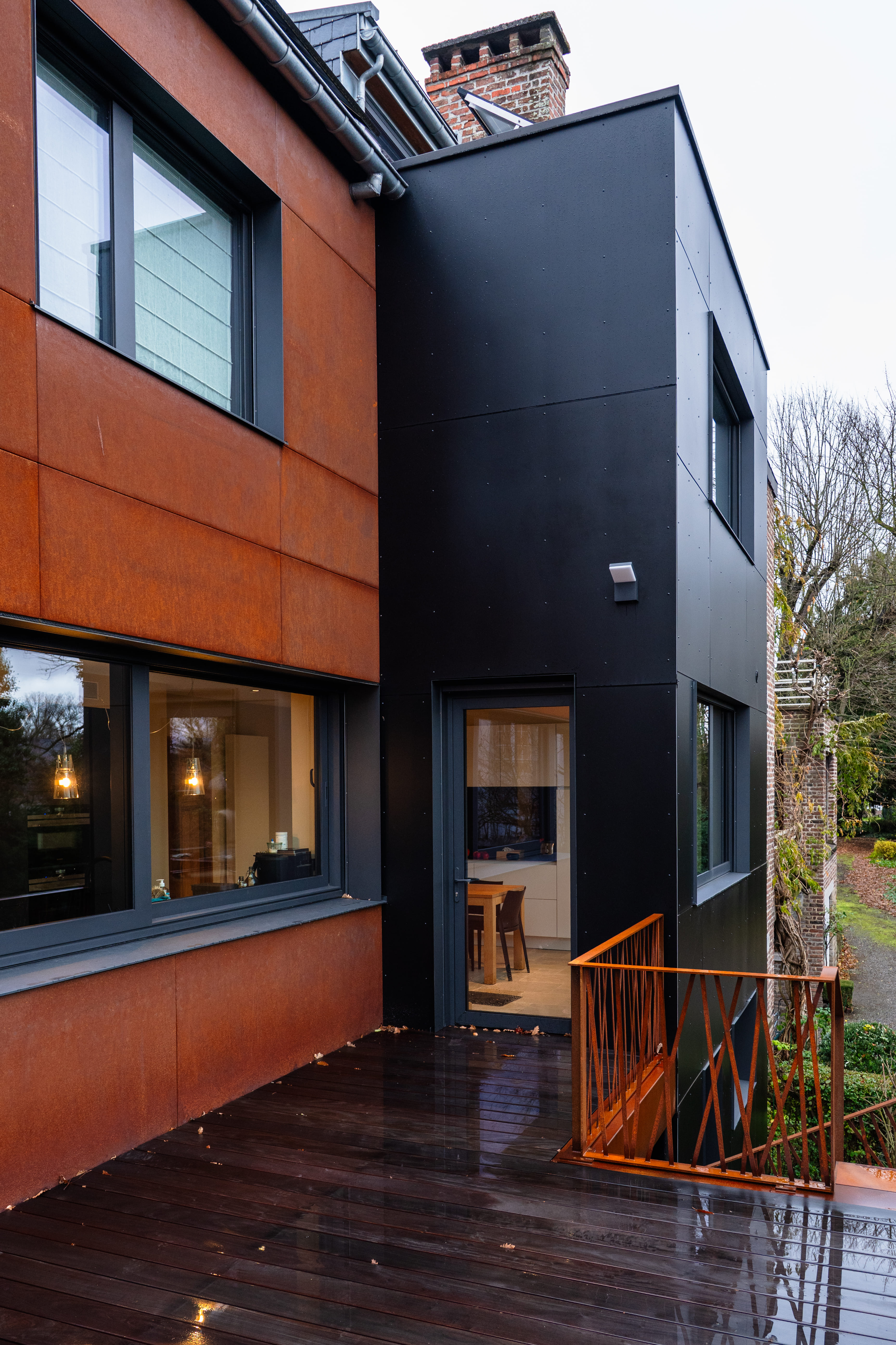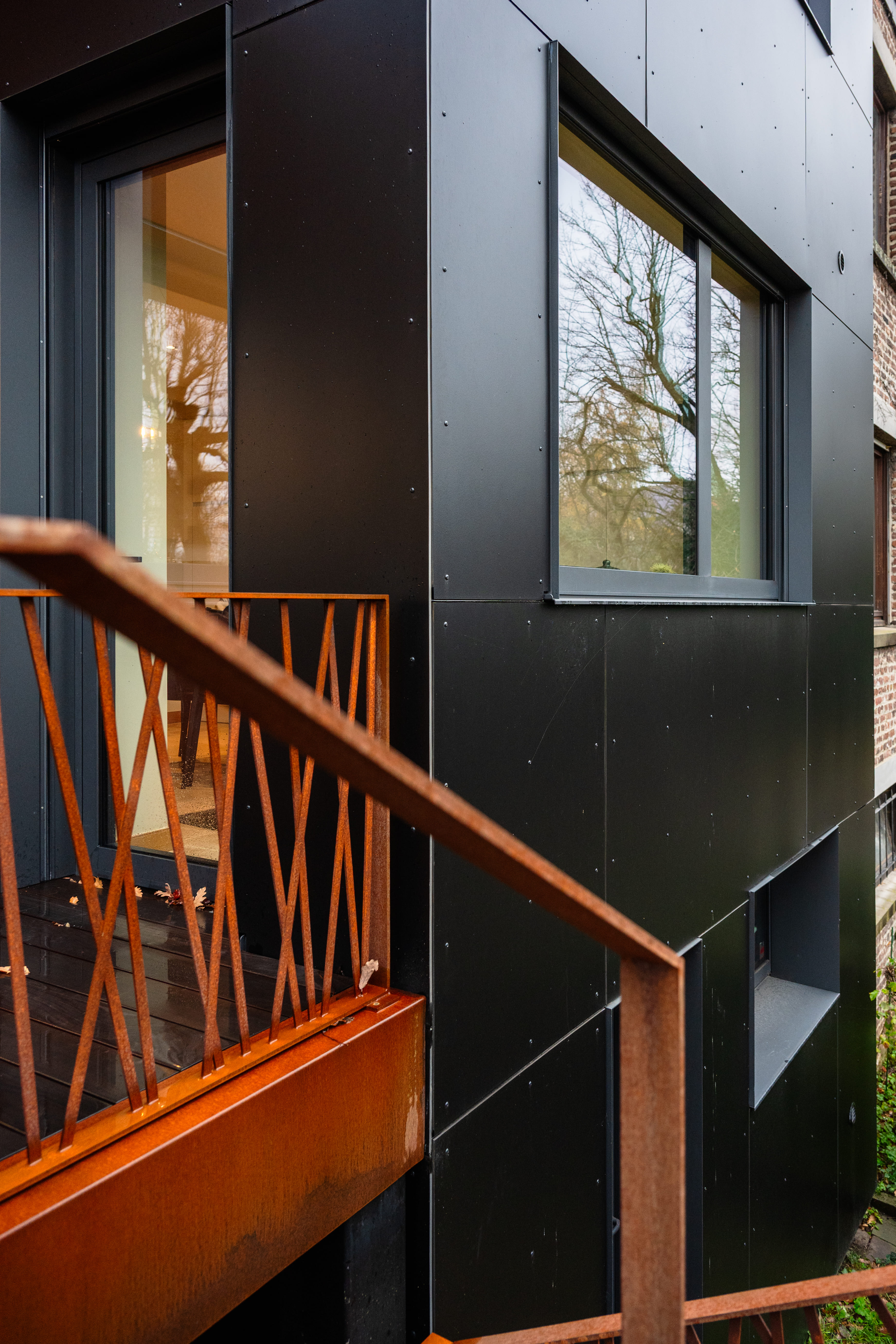 En façade arrière, la composition d’origine ayant moins d’intérêt, nous nous autoriserons davantage de liberté. Nous adoptons un vocabulaire contemporain dans le choix de matériaux de parement, permettant ici une isolation par l’extérieur. Des bardages en acier corten et en panneaux composites noirs recomposeront cette face du bâtiment. L’acier corten brut offrira texture et chaleur à l’ensemble, tout en s’accordant à son contexte boisé. Le Trespa, lui, lisse et noir, offrira un contraste, en s’harmonisant avec la teinte des toitures en ardoises naturelles. Les baies seront redimensionnées pour des raisons fonctionnelles, tout en conférant un rythme intéressant à cette partie remodelée.
