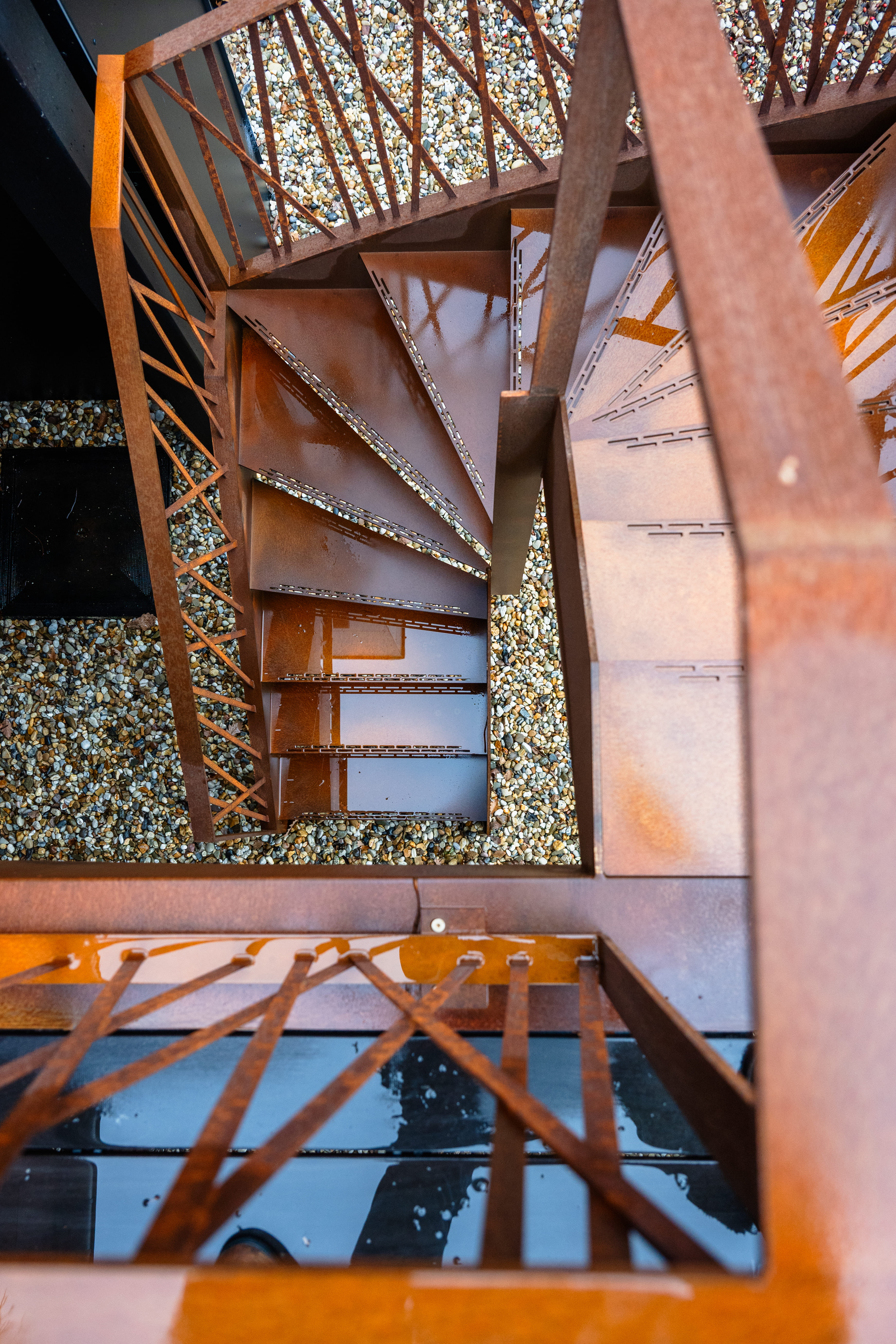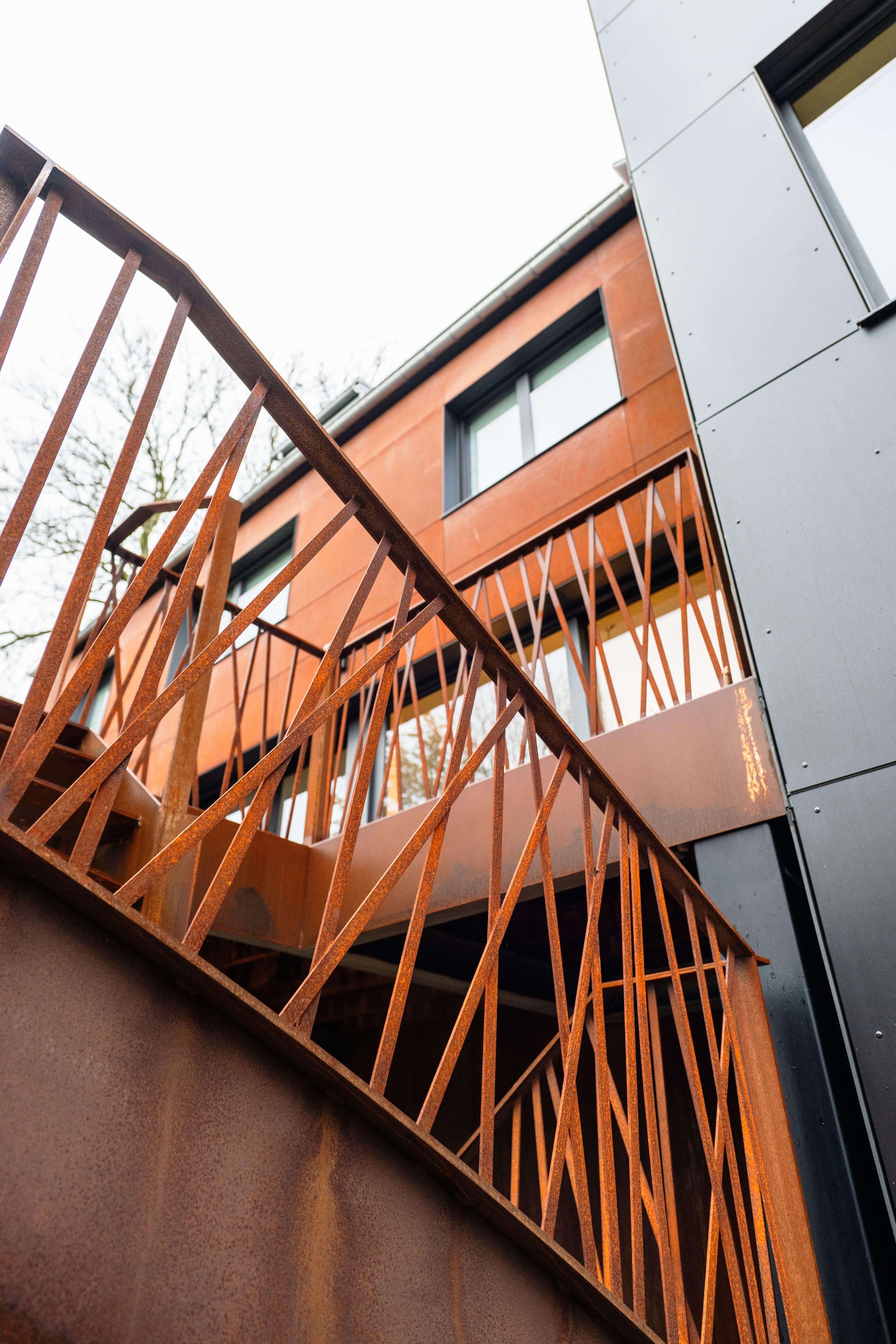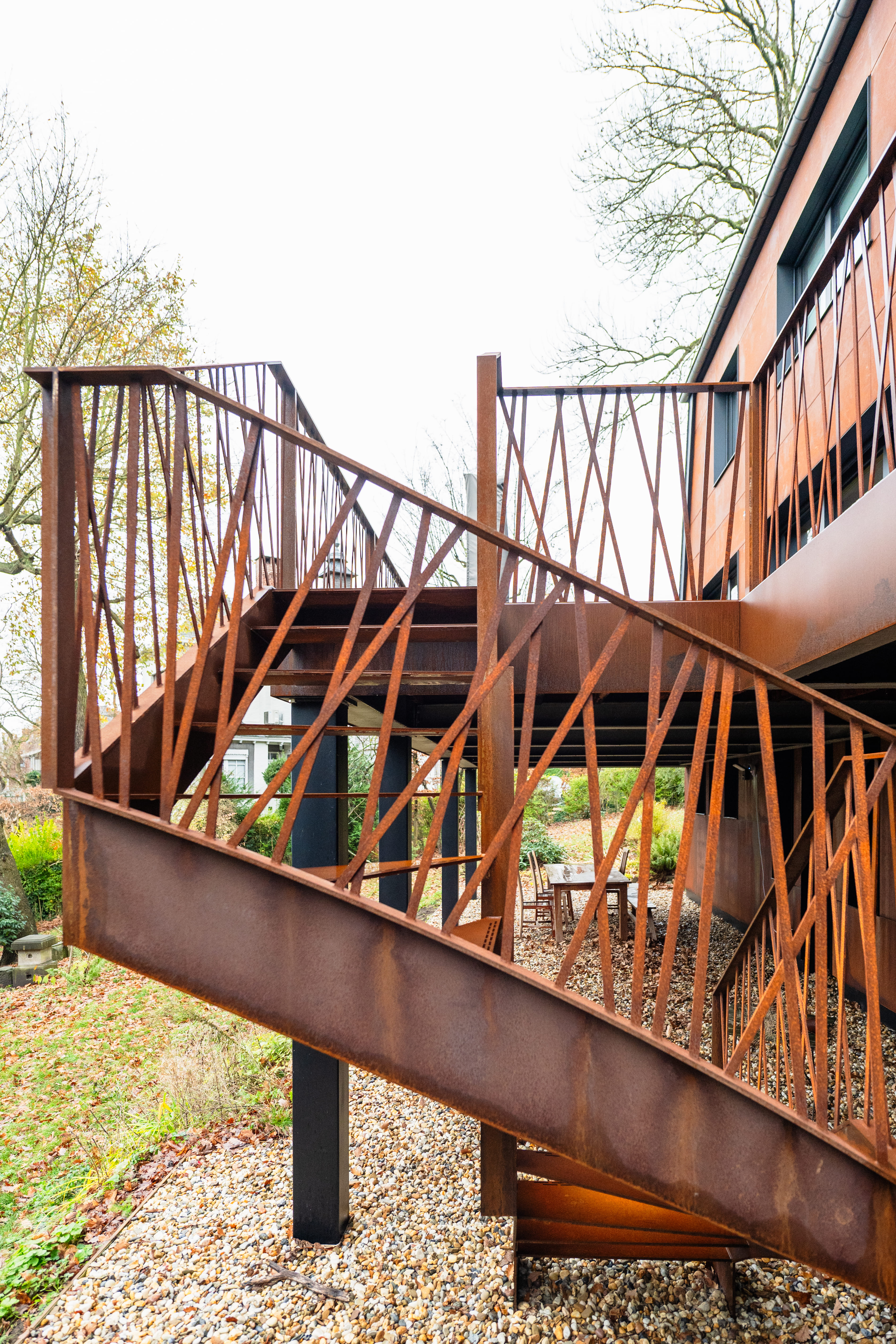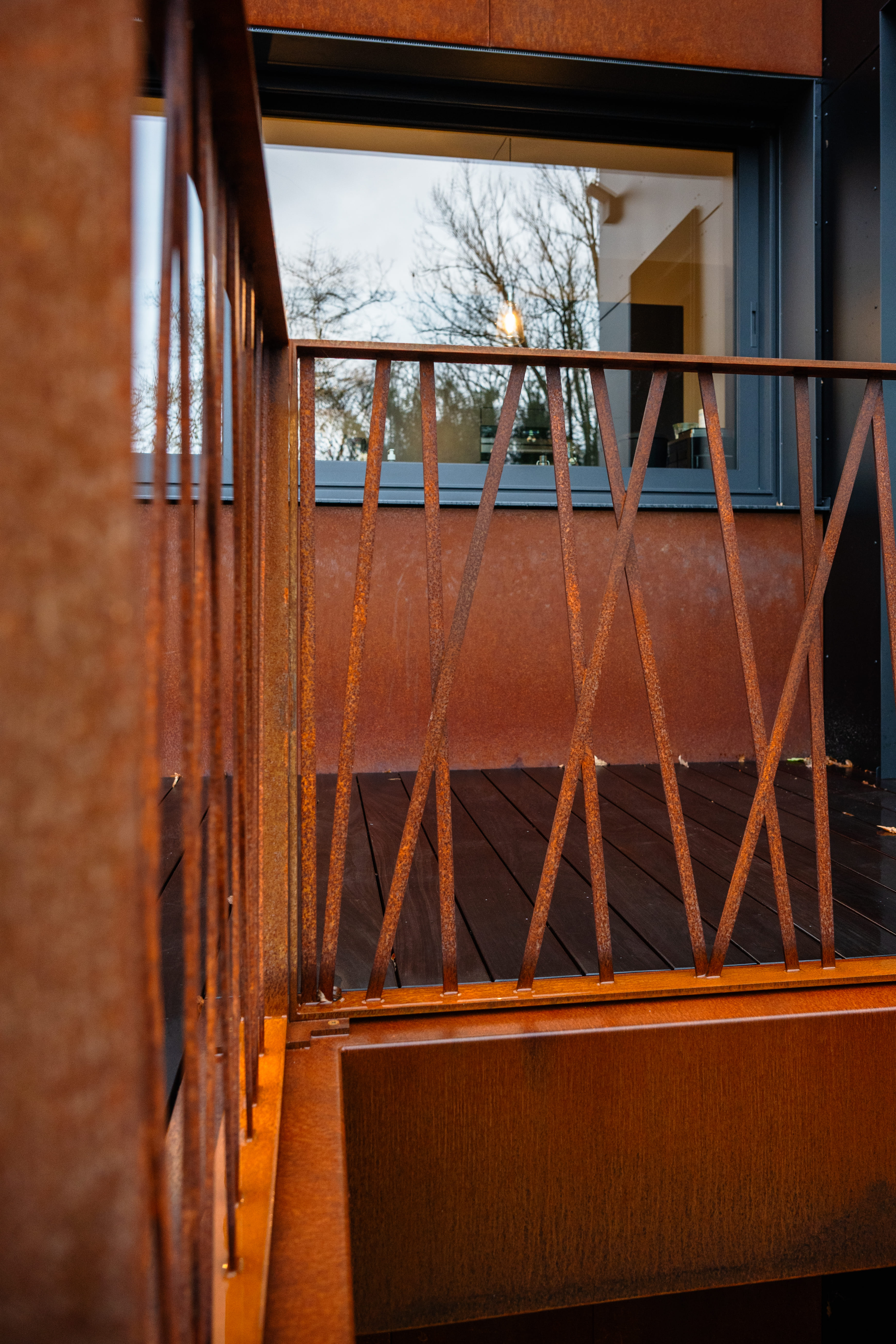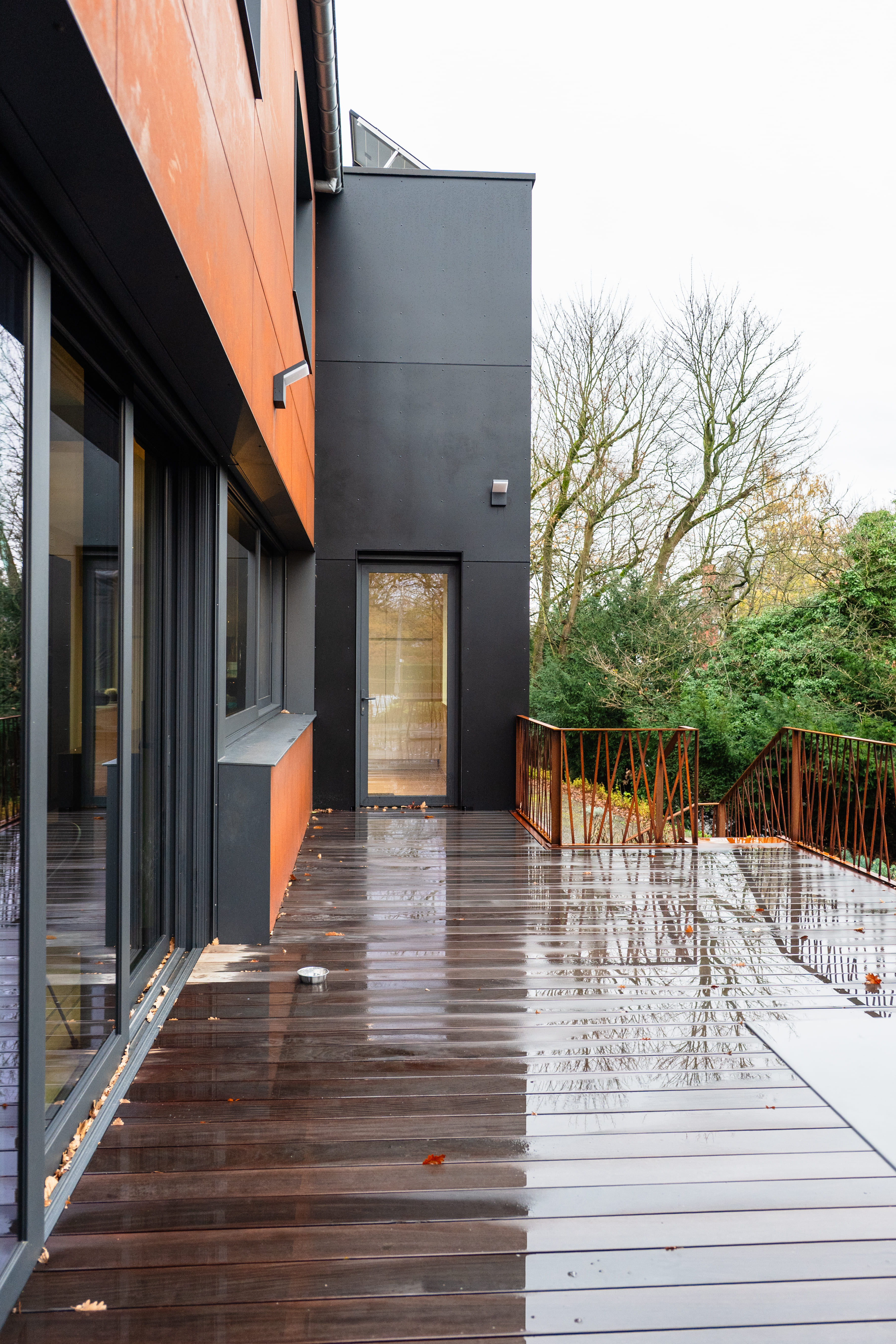 La création d’une terrasse en hauteur permettra de profiter d’un espace extérieur au même niveau que les pièces de séjour. Celle-ci réduira l’aspect massif et horizontal de cette façade et rendra l’ensemble plus léger. Le projet prévoit le remplacement de tous les châssis par des modèles aux subdivisions simplifiées. Aussi, des screens solaires intégrés dans les bardages réduiront la surchauffe l’été sur cette face exposée Sud. La terrasse sera composée d’une structure en acier thermolaqué et de garde-corps en acier corten. Finalement, nous étudierons les détails constructifs complexes de cette terrasse et garde-corps en collaboration avec un ferronnier et un ingénieur en stabilité.