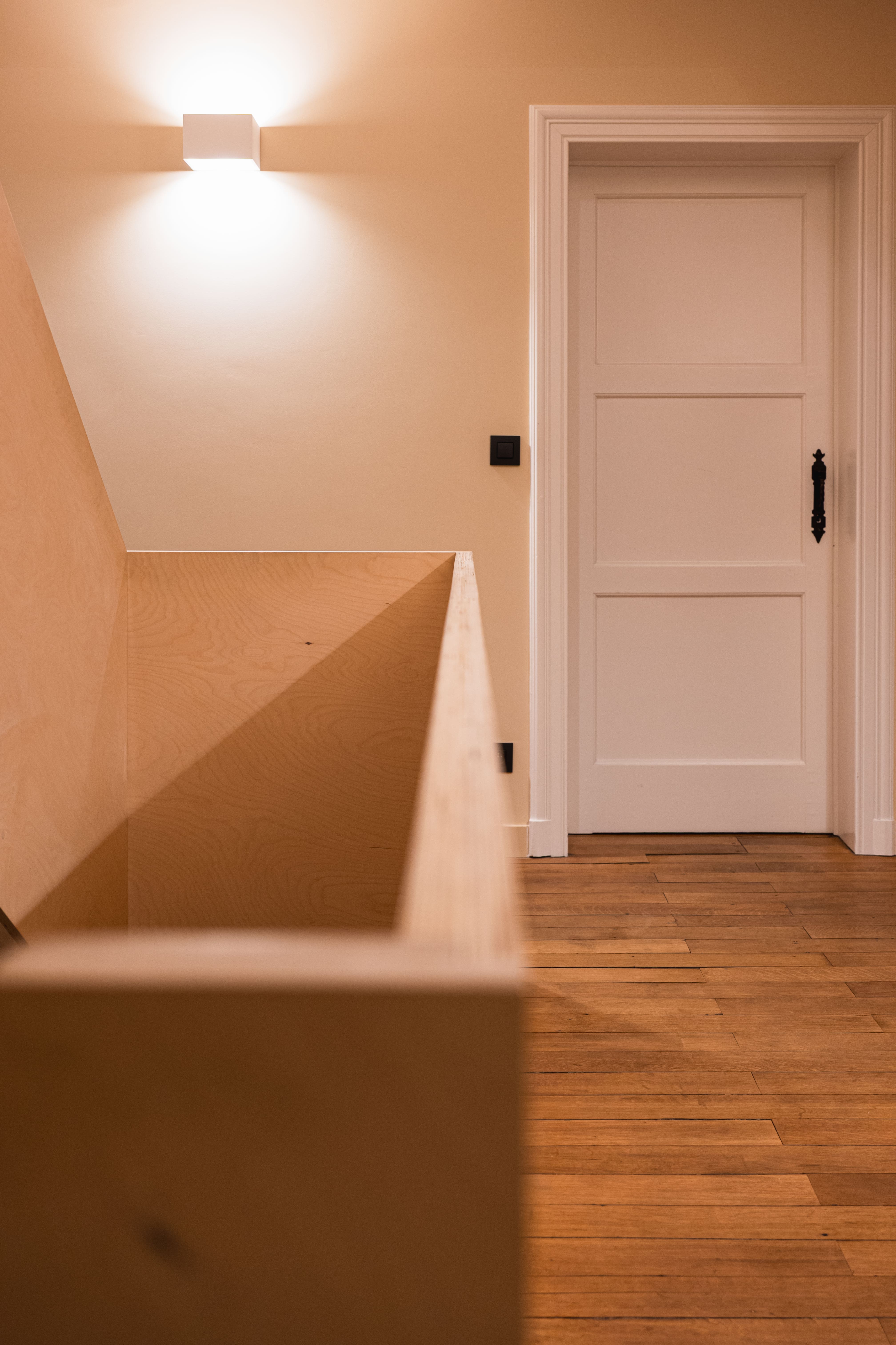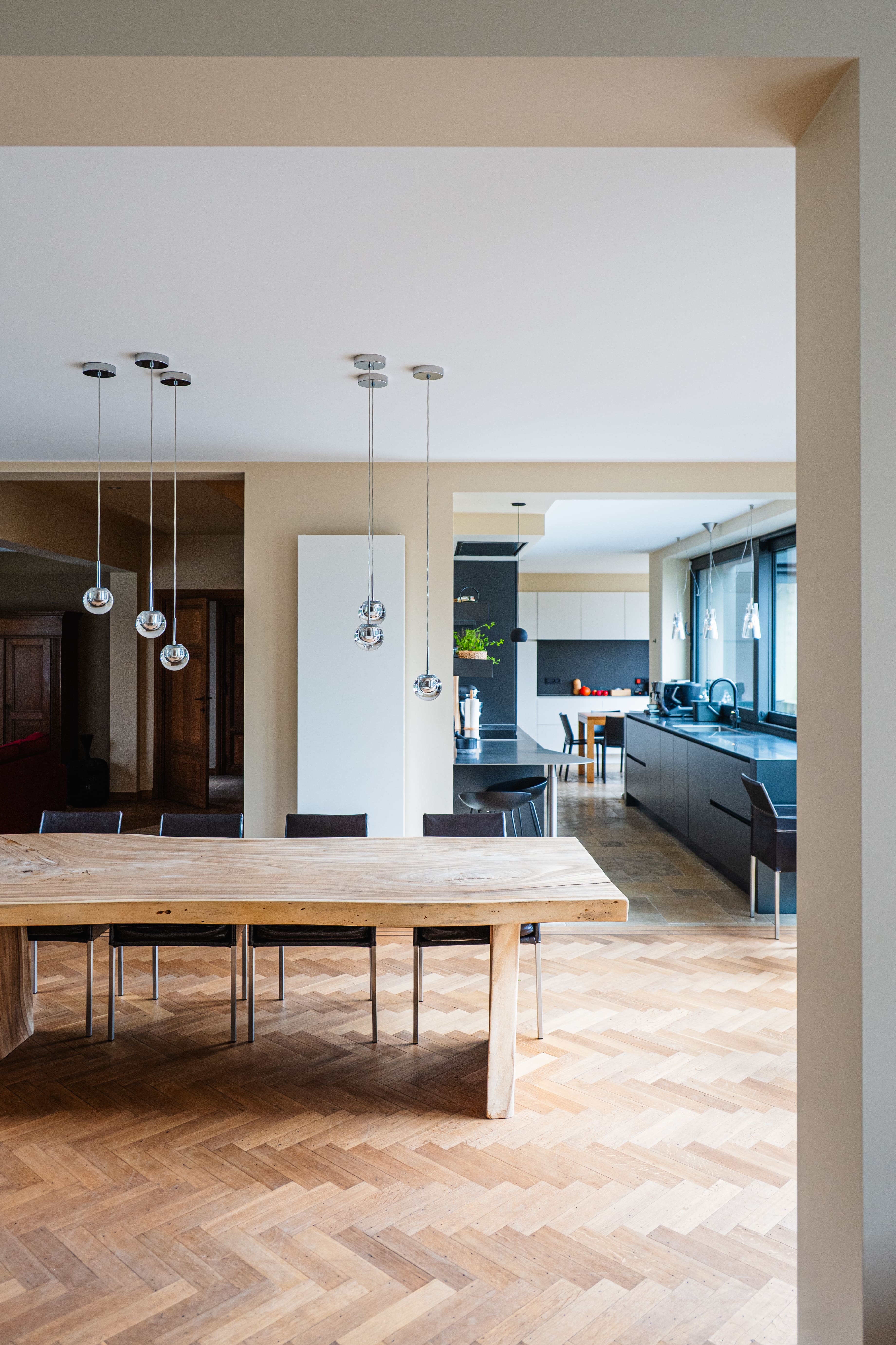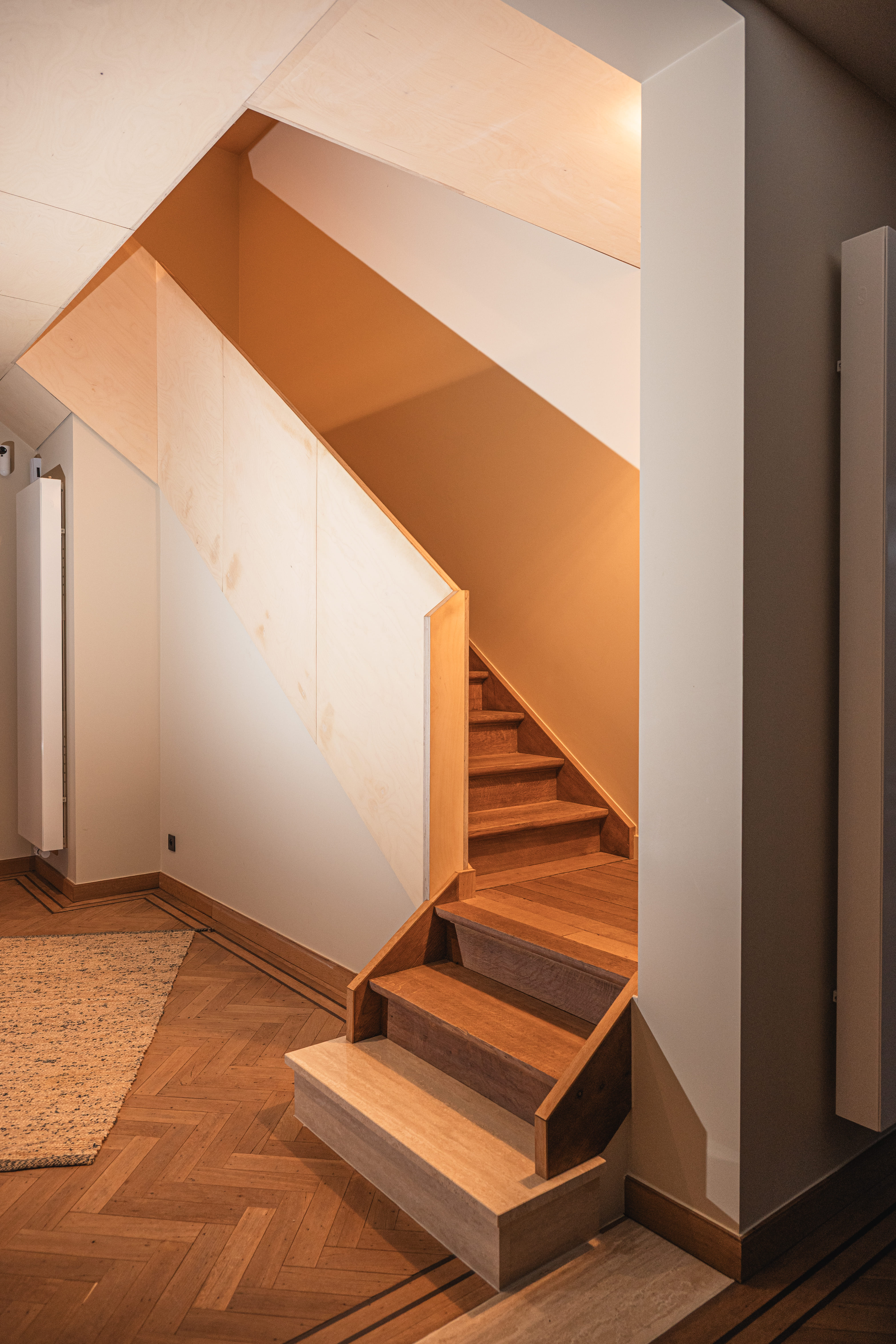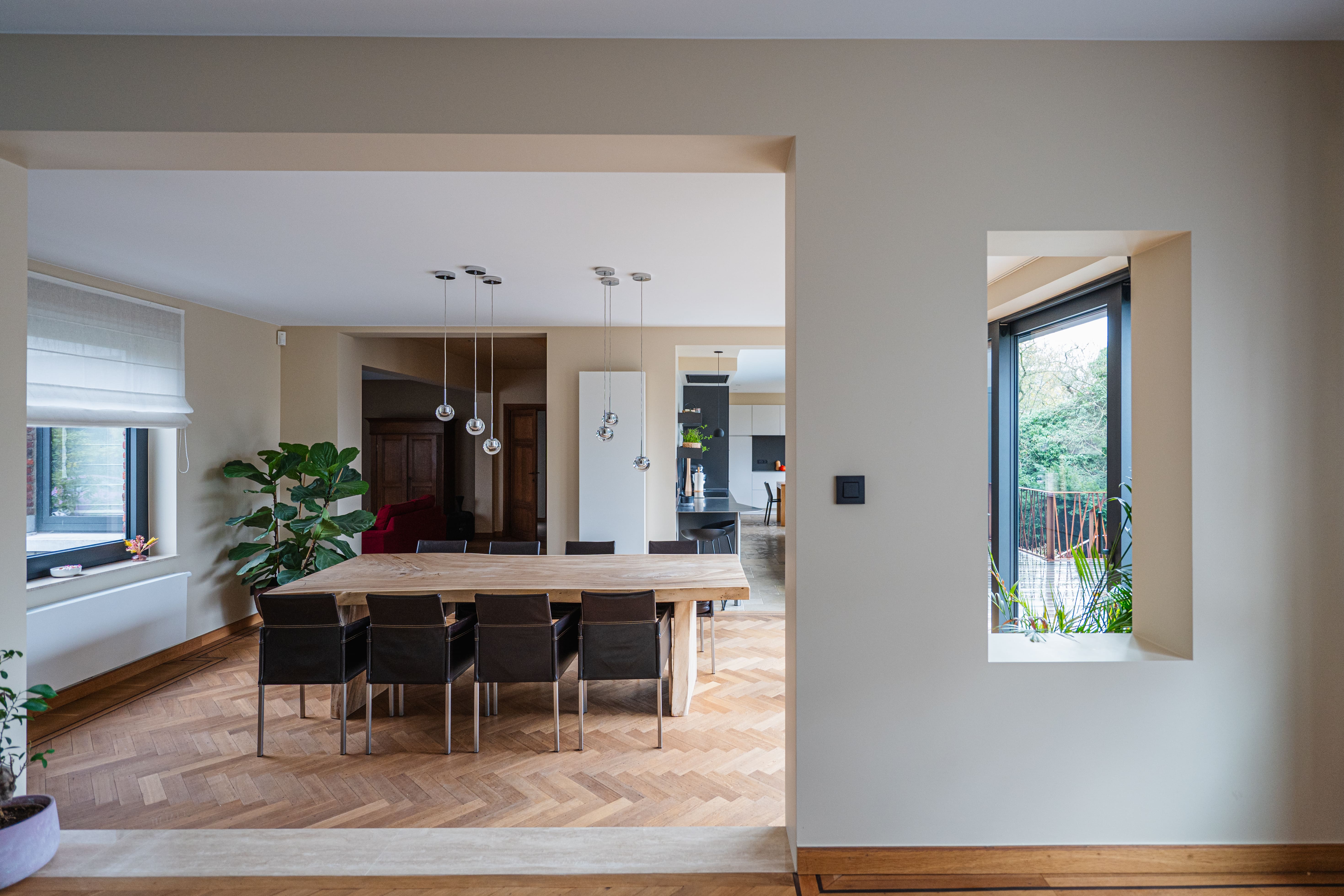 La rénovation intérieure concerne essentiellement le rez-de-chaussée. Les transformations permettront de répondre aux habitudes de vie actuelles. En effet, l’ouverture de larges baies intérieures et extérieures agrandira les espaces et créera une connexion visuelle avec l’extérieur. La stabilité des ouvrages sera étudiée avec notre ingénieur en construction. Toutes les installations techniques et les parachèvements seront rénovés. Les menuiseries intérieures d’époque seront rénovées, telles que parquets, portes et escaliers en chêne massif. Un nouveau garde-corps longeant la grande cage d’escalier centrale amènera une note contemporaine à cet intérieur totalement rénové.