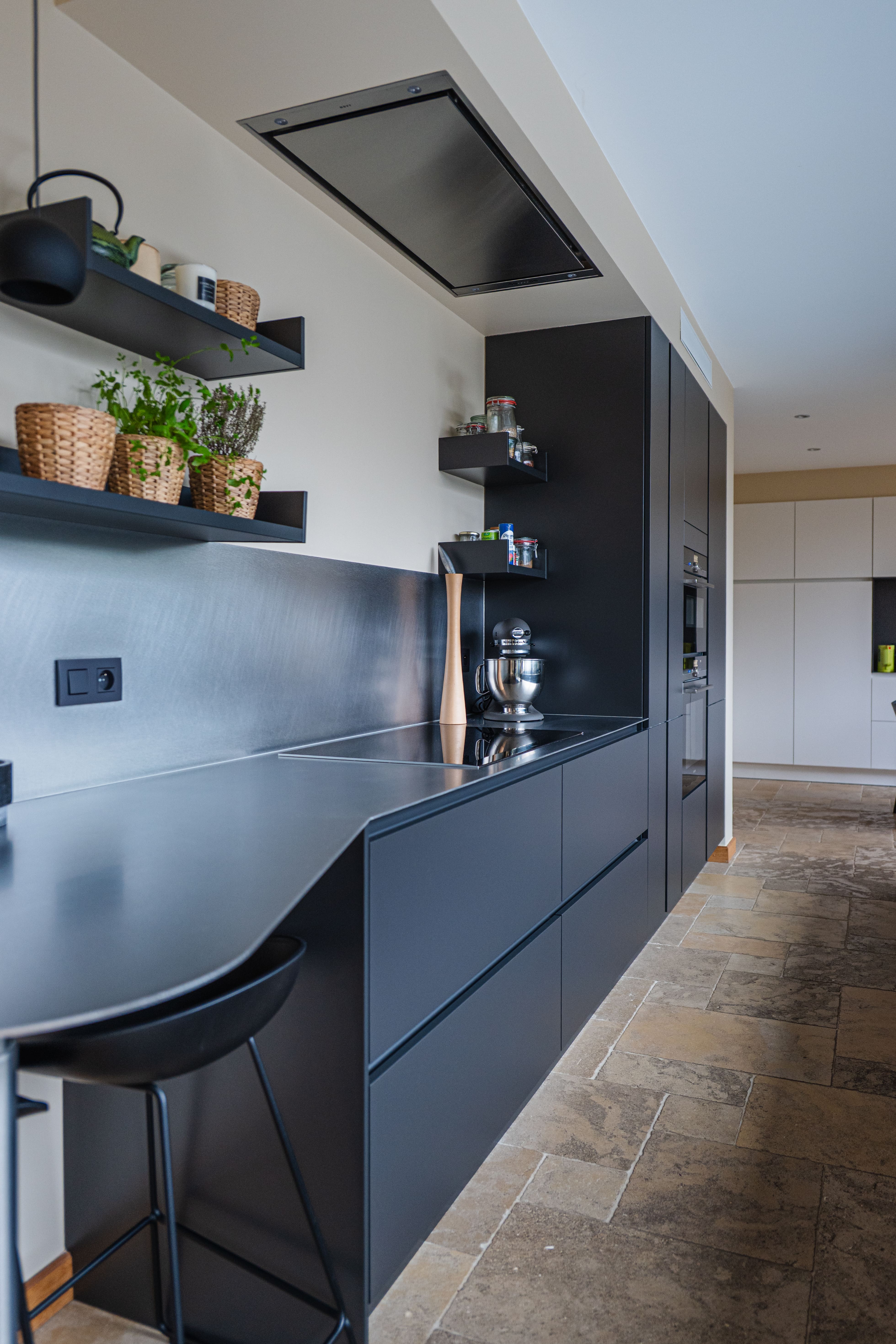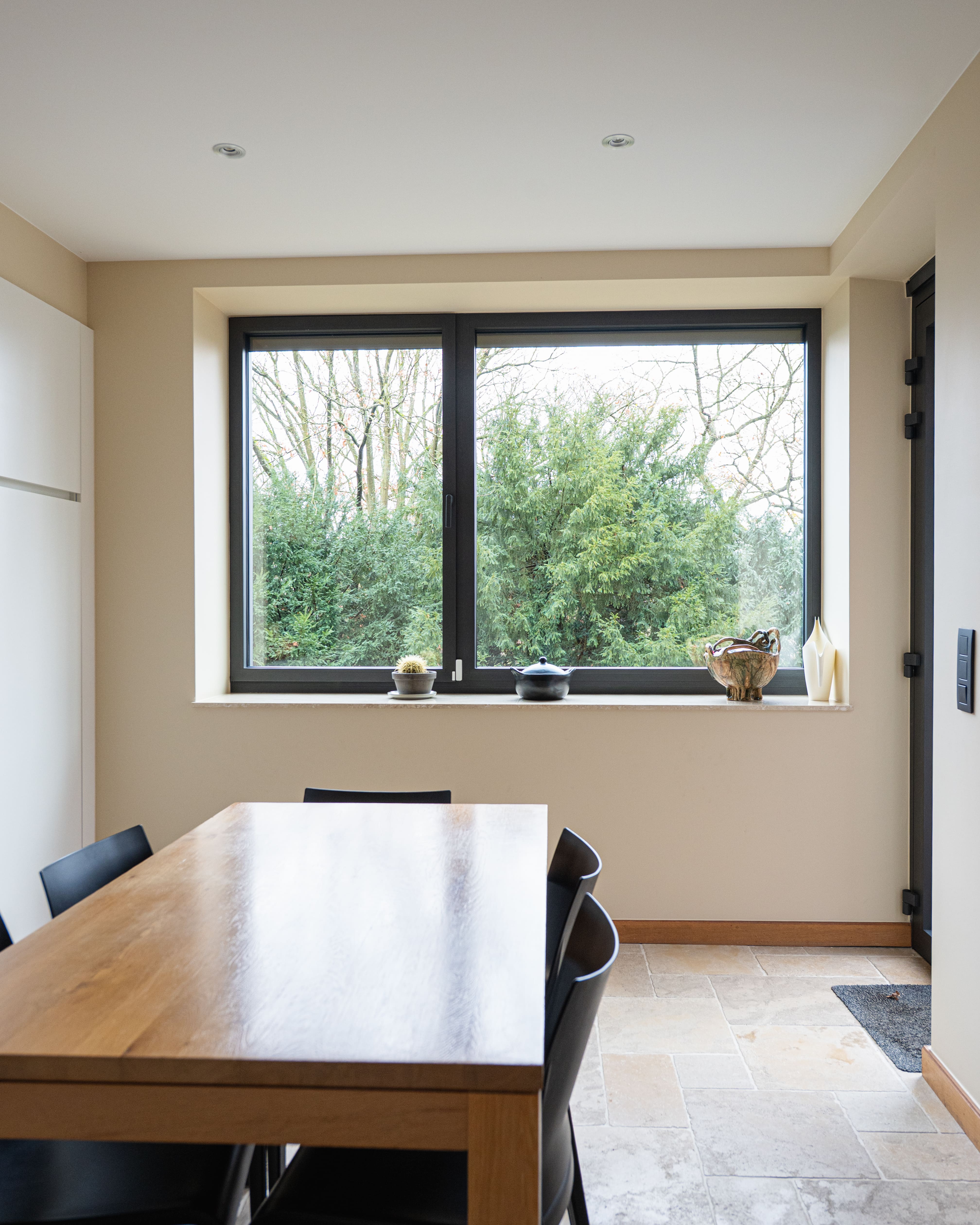 Afin de préserver l’harmonie avec le voisinage, les façades avant et latérales conservent leur aspect d’origine. Seuls les parements et boiseries sont rénovés, tandis que de nouveaux châssis en aluminium noir apportent une touche de modernité. La suppression de petits appentis vient purifier la lecture architecturale.